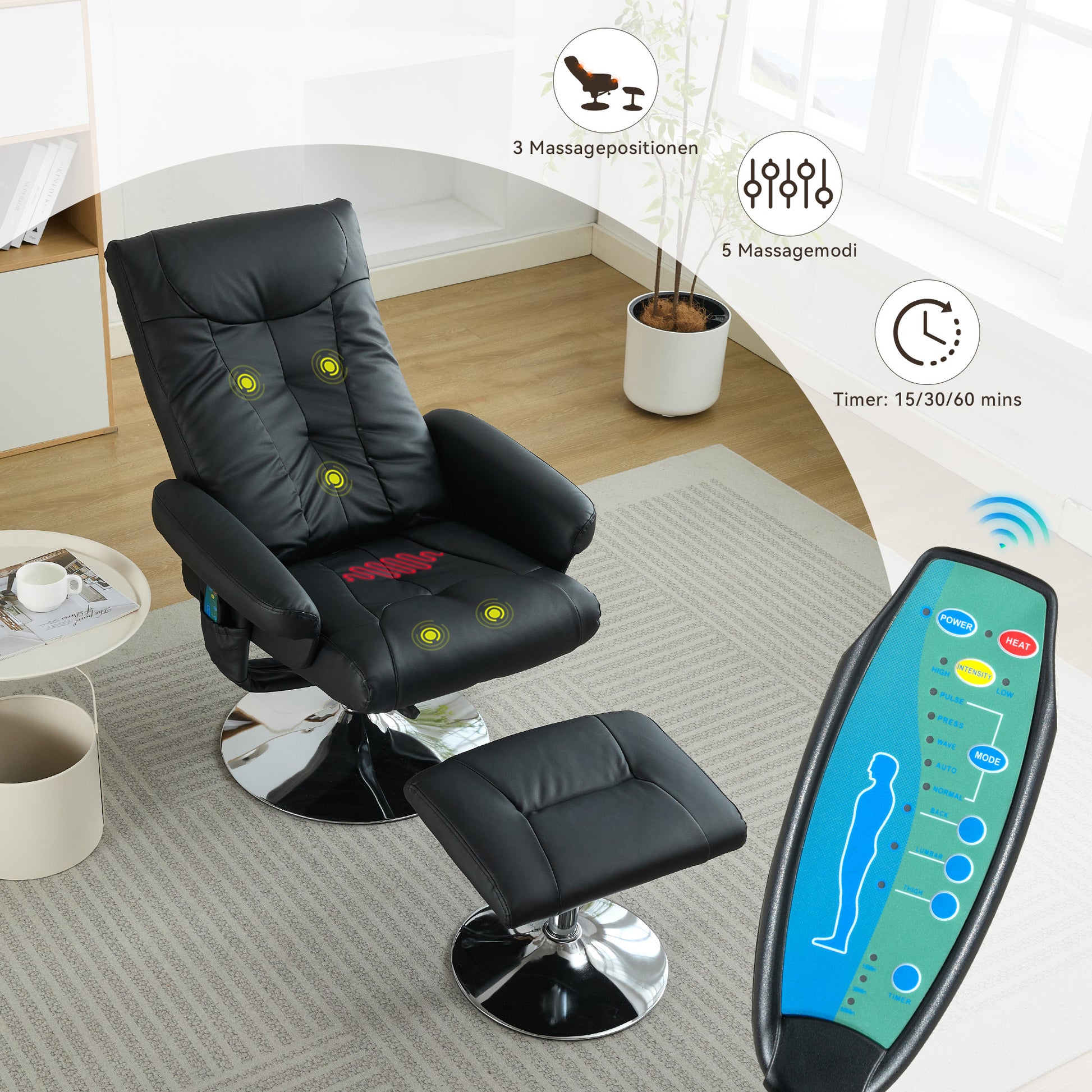 Five-Point Massage with Three Intensity Levels: Features five vibration points for a targeted back massage. Easily adjust the duration (15/30/45 min) with the remote control.