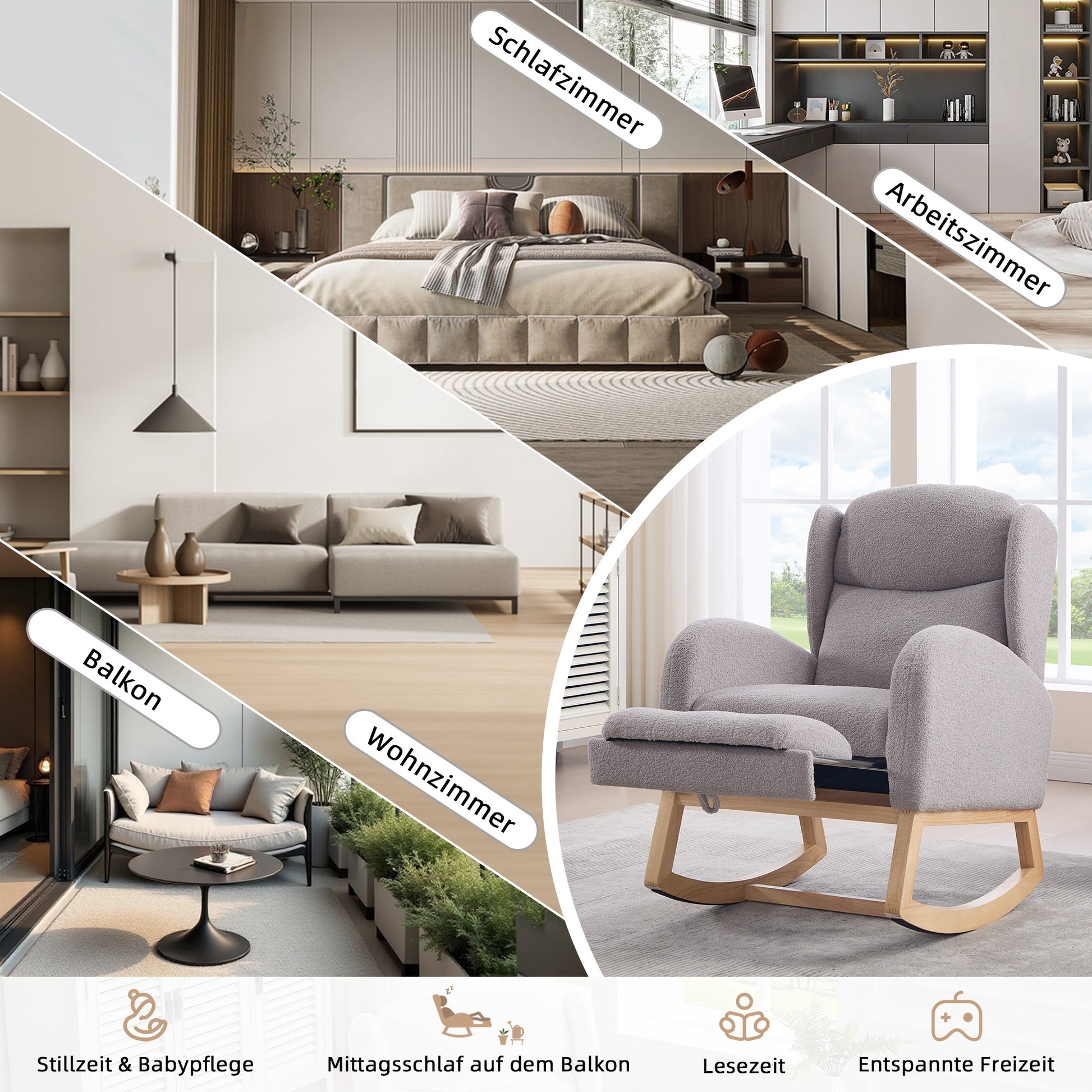 * **Simple Installation & Multilingual Support:** Comes with a straightforward installation manual and a multilingual user guide, ensuring easy assembly for every household to quickly enjoy the comfort of this rocking chair.-----Product Specifications: * **Product Composition:** Teddy fabric, foam padding, wooden frame, wooden rocking legs, sliding footrest, padded cover, floor protection, and insulation layer.