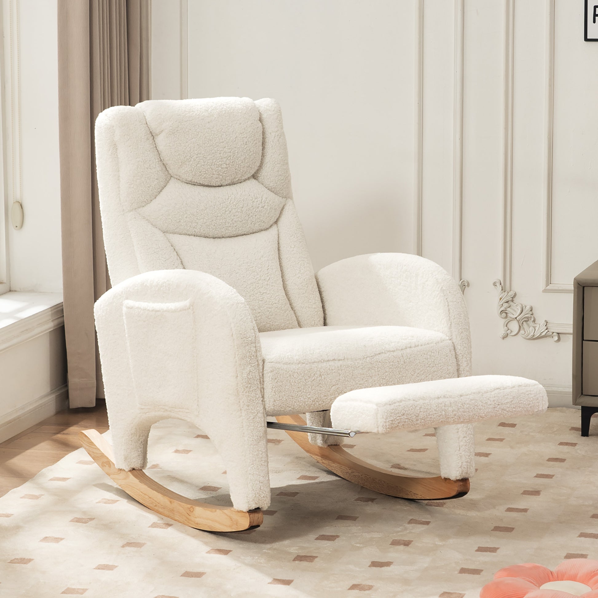 052 Rocking Chair, Upholstered with Armrest, 110 kg, White Teddy Fabric