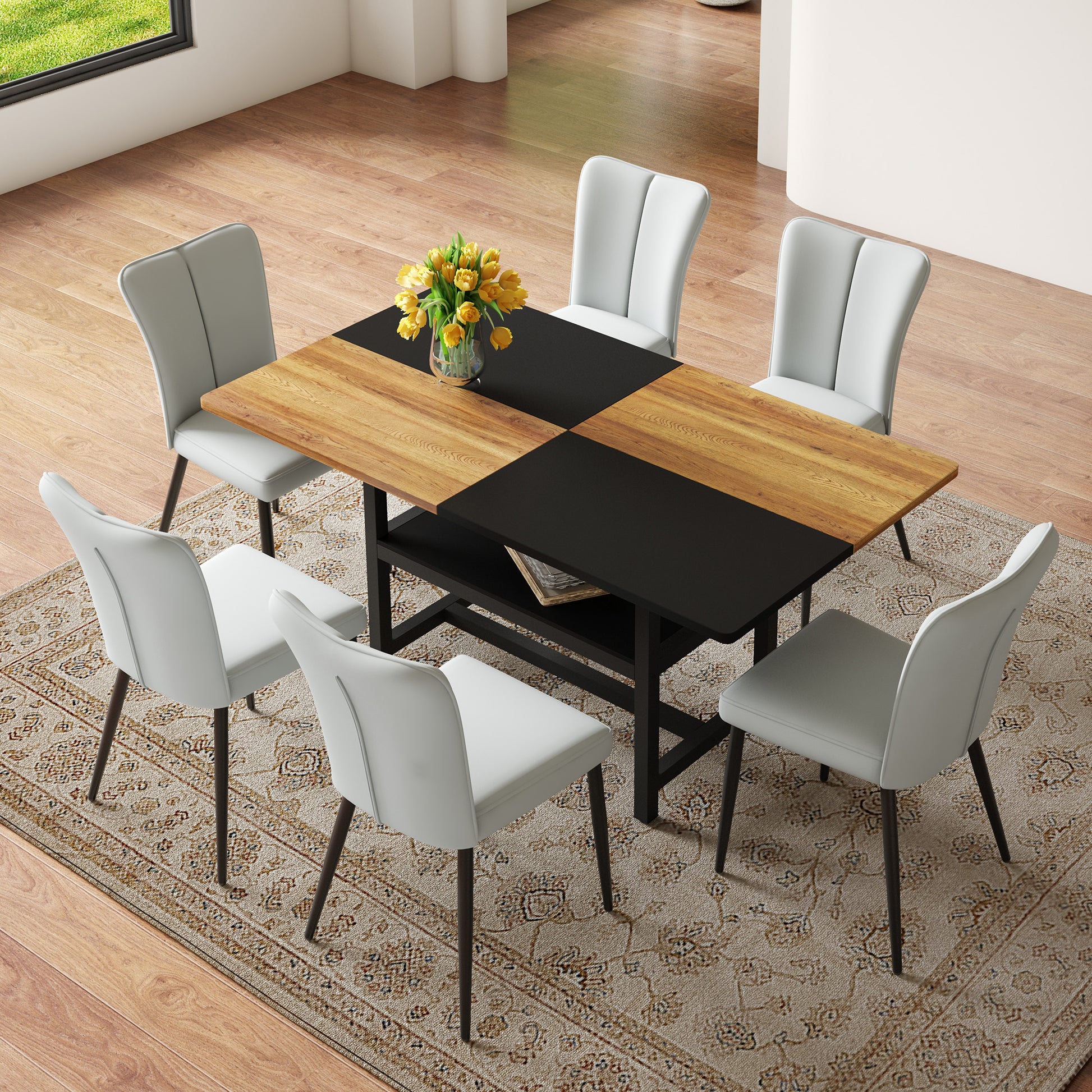 160 cm Dining Table Set with Storage & 6 Chairs, Light Grey PU Leather