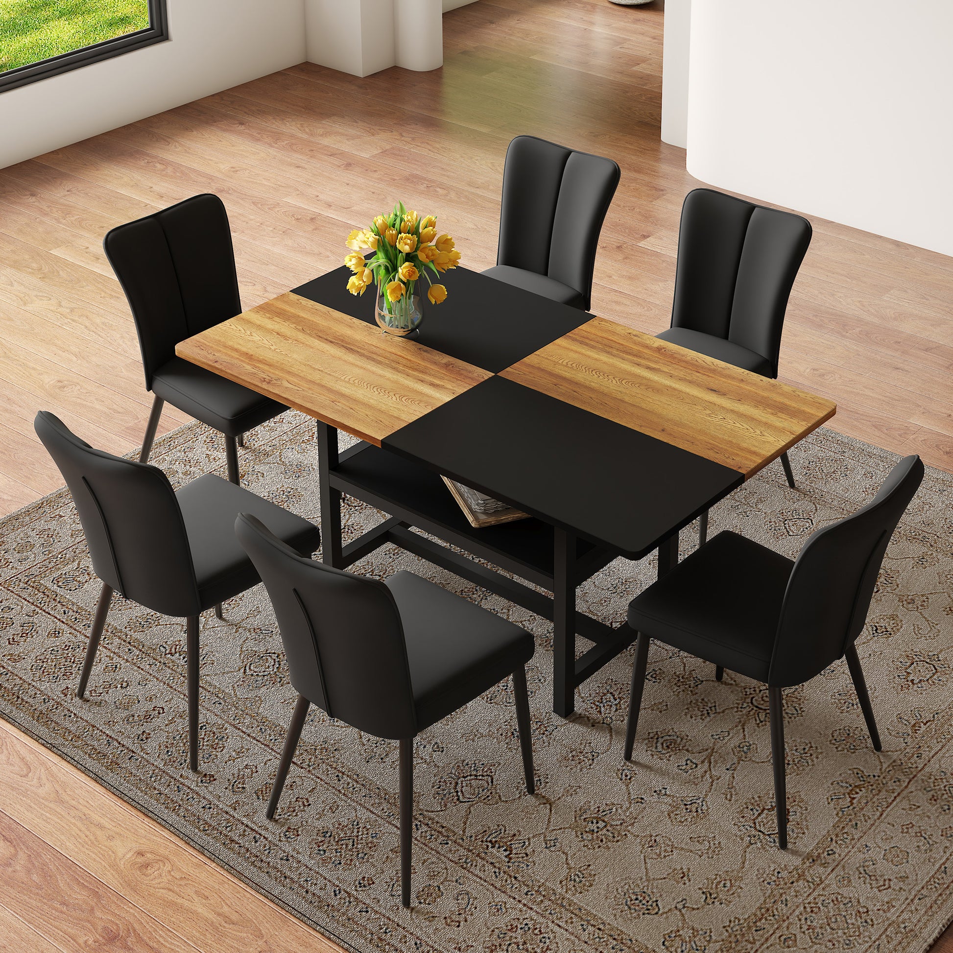 This 160 cm rectangular dining table set is complemented by four black PU dining chairs. The uniform black color scheme is simple and elegant, exuding a subtly luxurious feel. It integrates easily into various interior design styles, such as modern minimalism and industrial style, or emphasizes a touch of understated luxury, adding a special accent to the room.