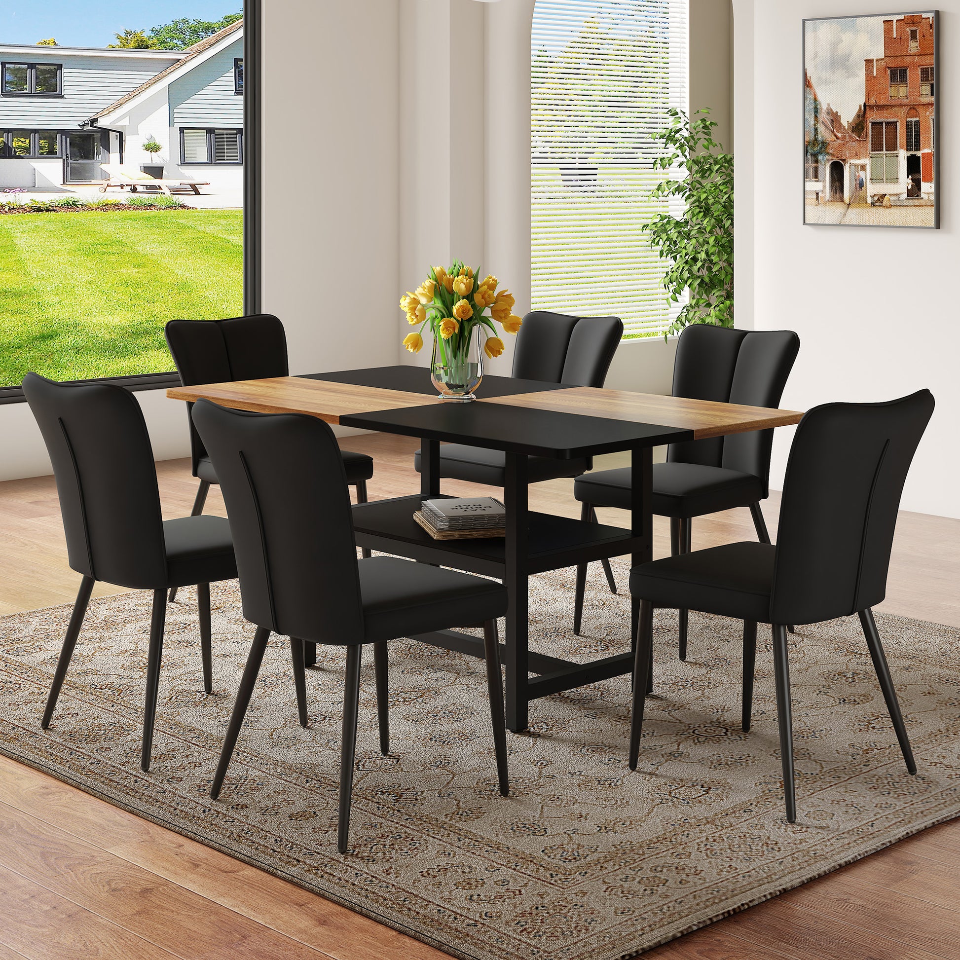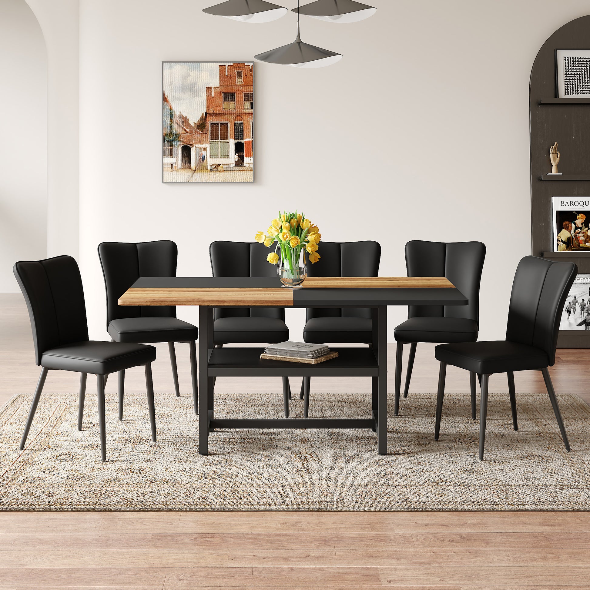 160 cm Rectangular Dining Table Set, 6 Black PU Chairs with Storage, Black Metal Legs