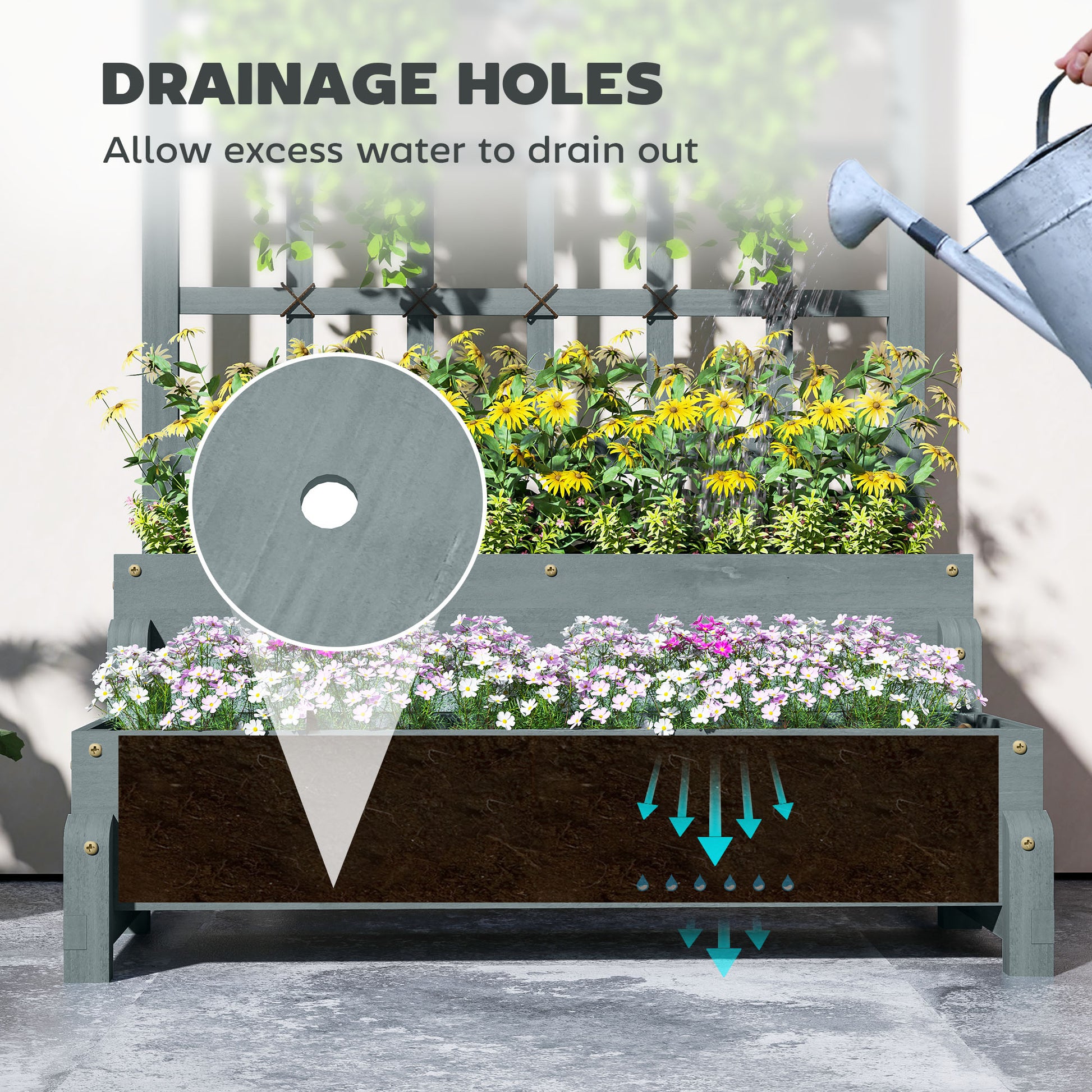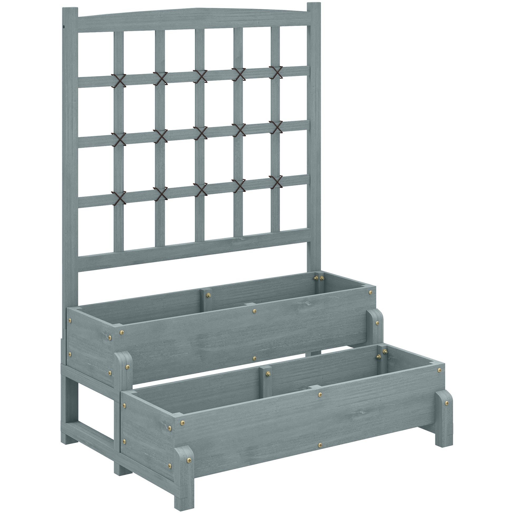 2-Tier Raised Garden Bed, Elevated Planter with Trellis and Drainage, Wooden Grey