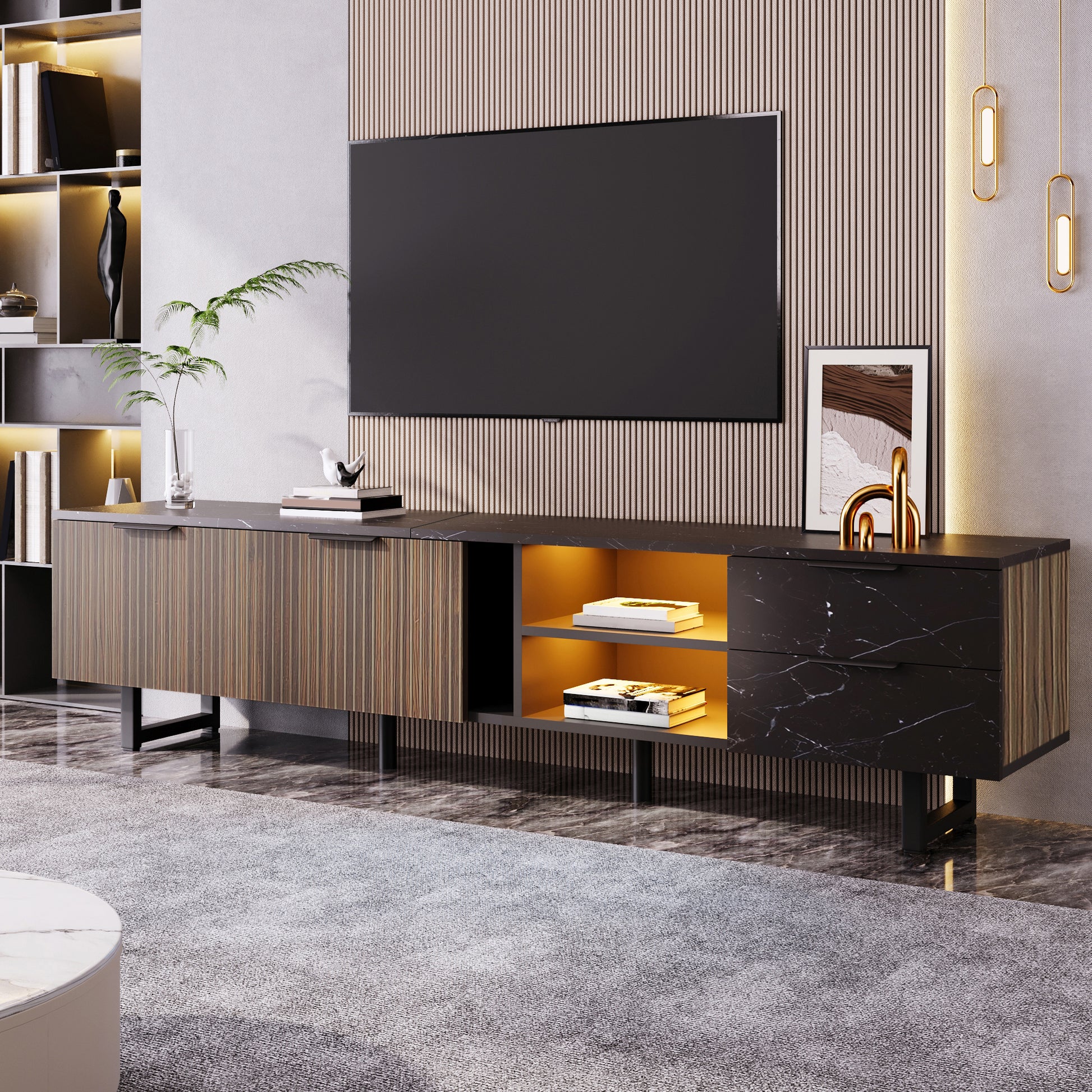 200cm TV Cabinet, Adjustable LED Lighting, Two Doors/Drawers, Black Marble Look/Dark Wood Grain