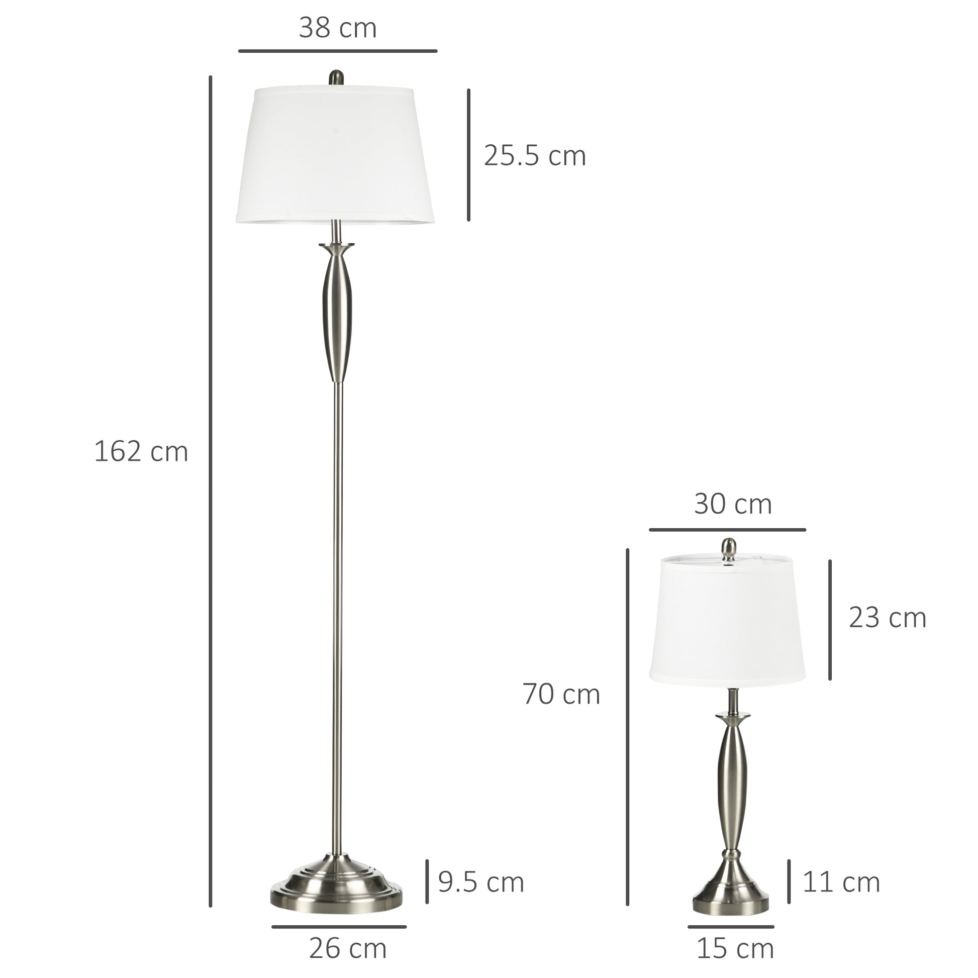 The floor lamp dimensions are Ø38 x 162H cm, and the table lamp dimensions are Ø30 x 70H cm. Each lamp requires one E27 40W light bulb (bulb not included), compatible with types such as halogen or LED. Simple assembly is required.
