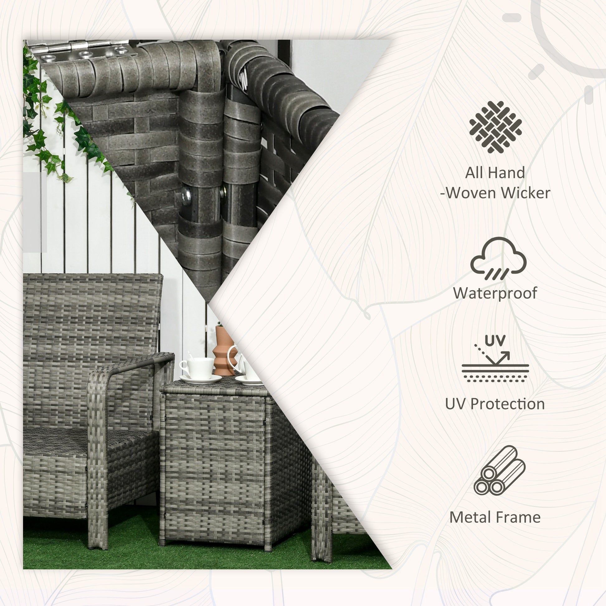 This three-piece rattan bistro set includes two armchairs and a matching table with 72L of inner storage space, making it excellent for relaxing with a friend outdoors in all garden and outdoor spaces.