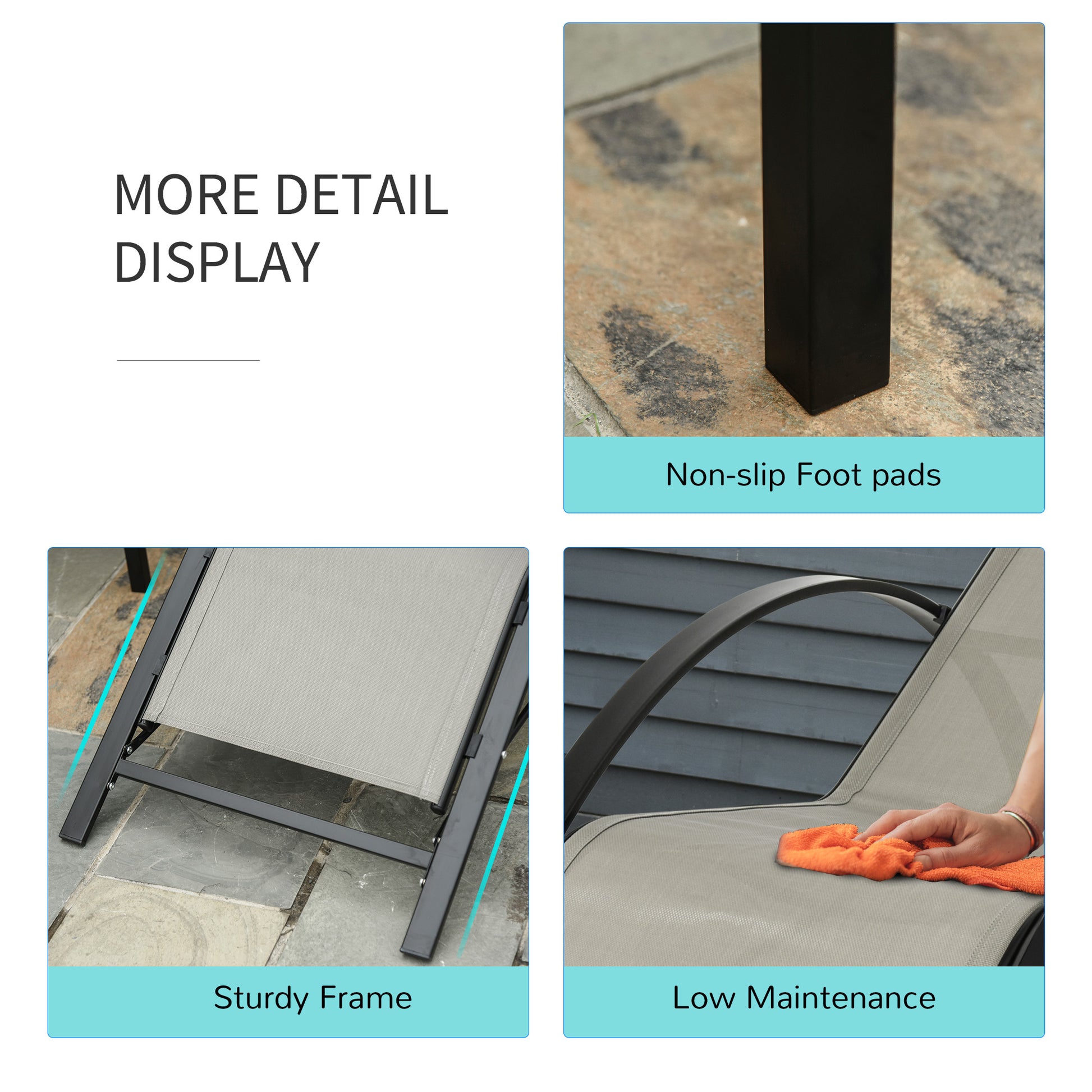 Metal Frame: A solid and tough structure for the garden recliner that is durable for an extra lifespan. The tempered glass table-top is solid and a safe holding surface.