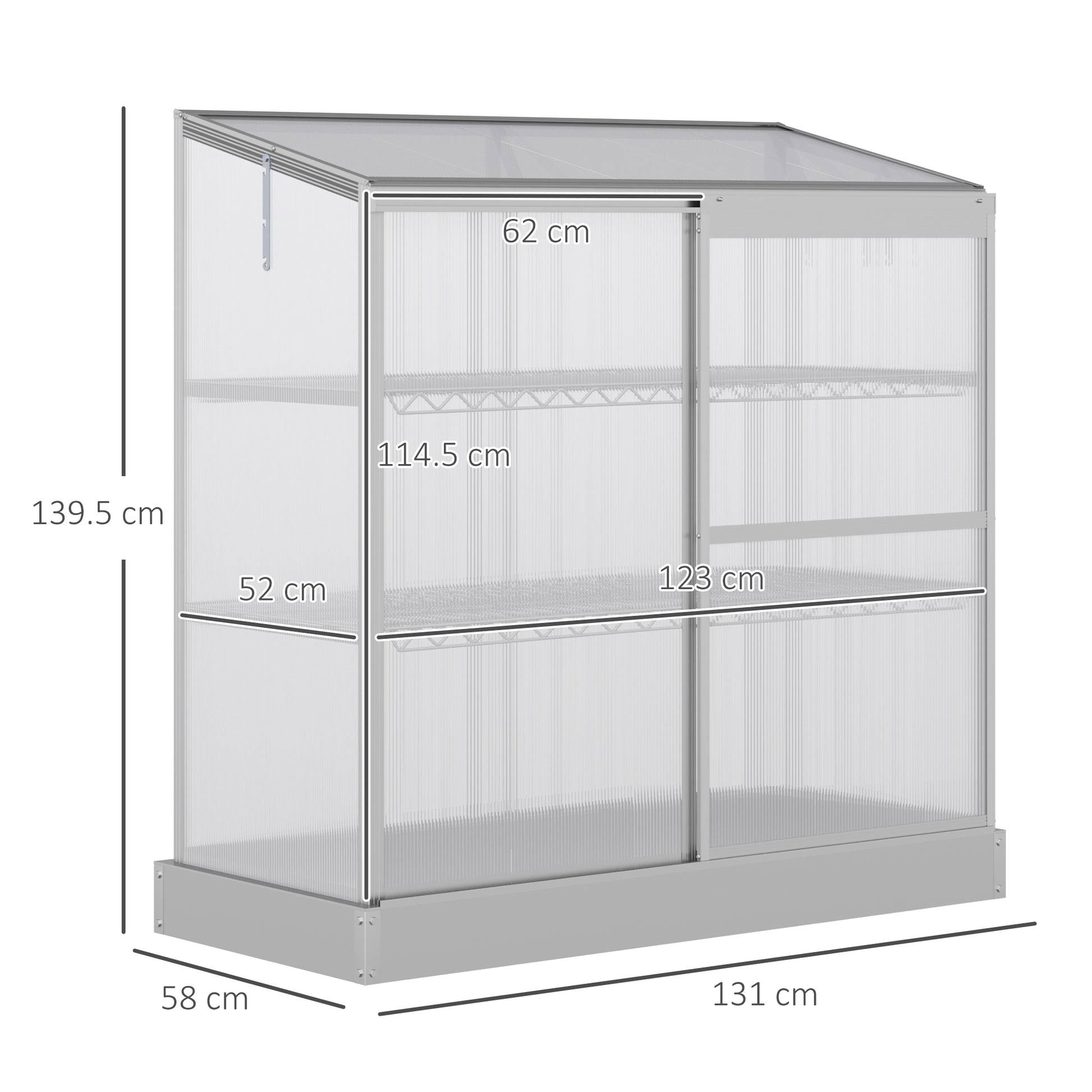 DIMENSIONS: 139.5H x 131L x 58Wcm. Coldframe For Garden Door: 91H x 62Wcm. Shelves: 53Hcm, 91Hcm.