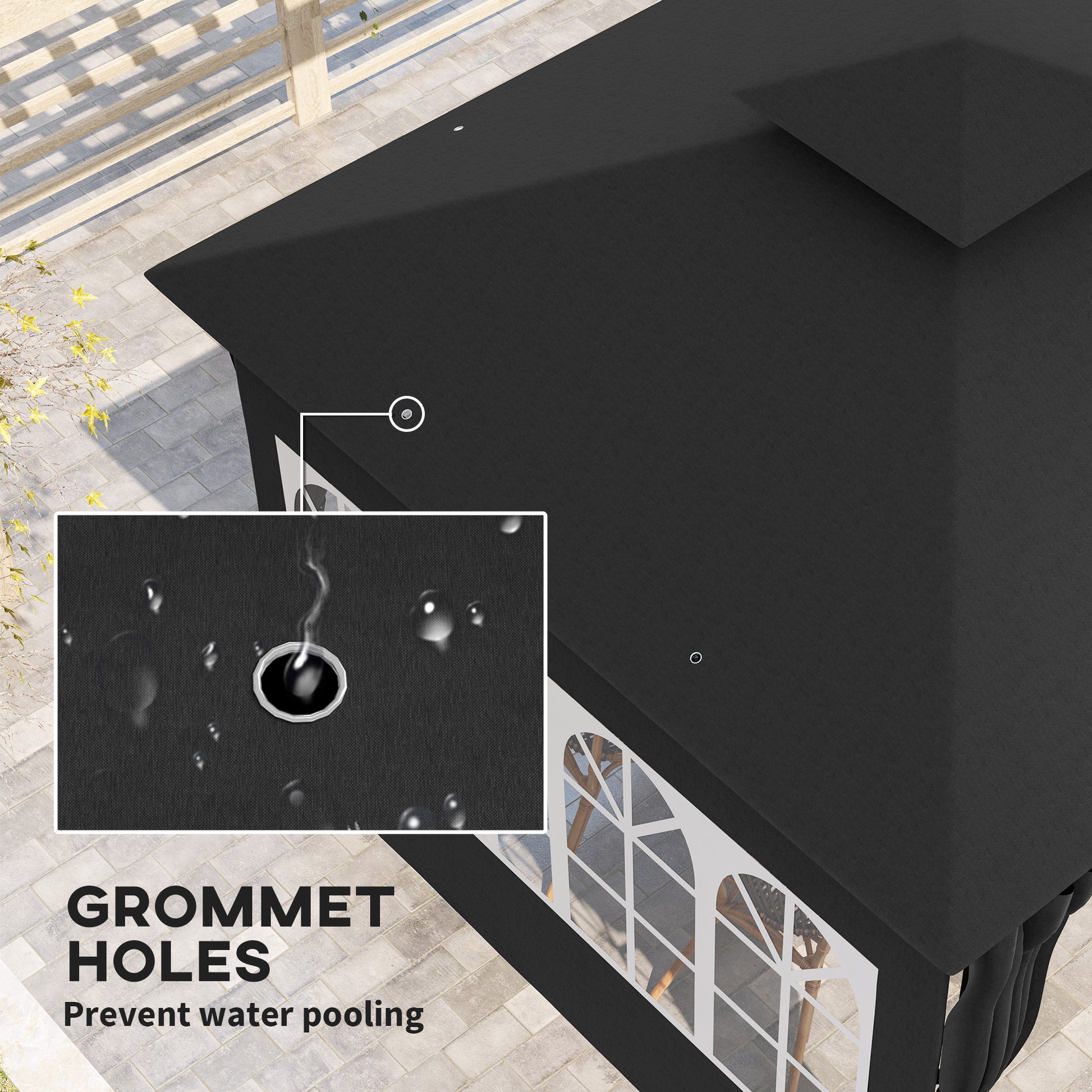The weather-resistant design features a PA-coated double-tier roof for enhanced airflow and UV protection. It also includes a splash-resistant polyester canopy with eight grommet holes to prevent water pooling.