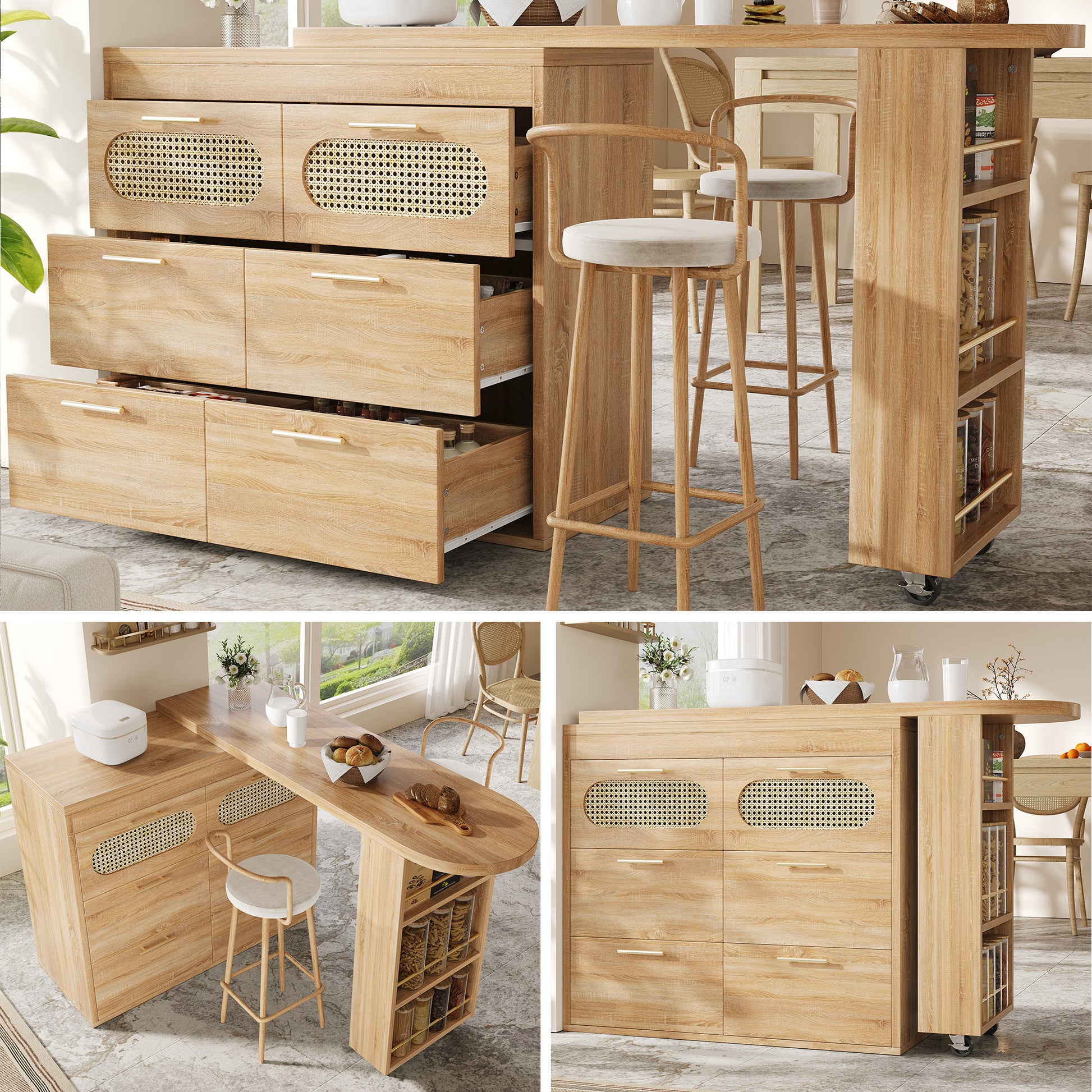 360° Rotating Bar Table with 6 Drawers and Anti-Tip Device, PE Rattan and Metal