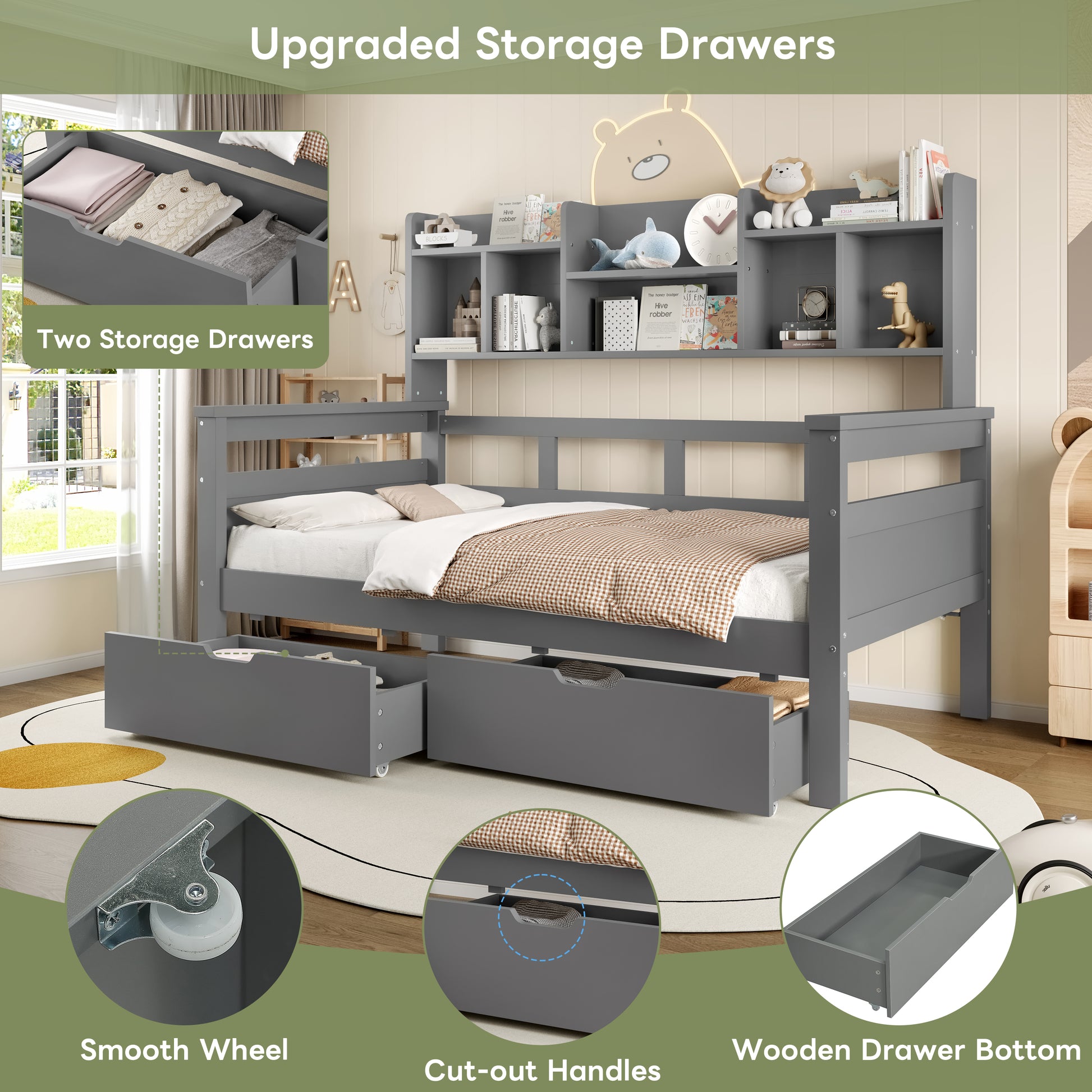 3ft Single Bed with Two Storage Drawers, Bookcase Headboard, and Guardrail, Wooden, Grey