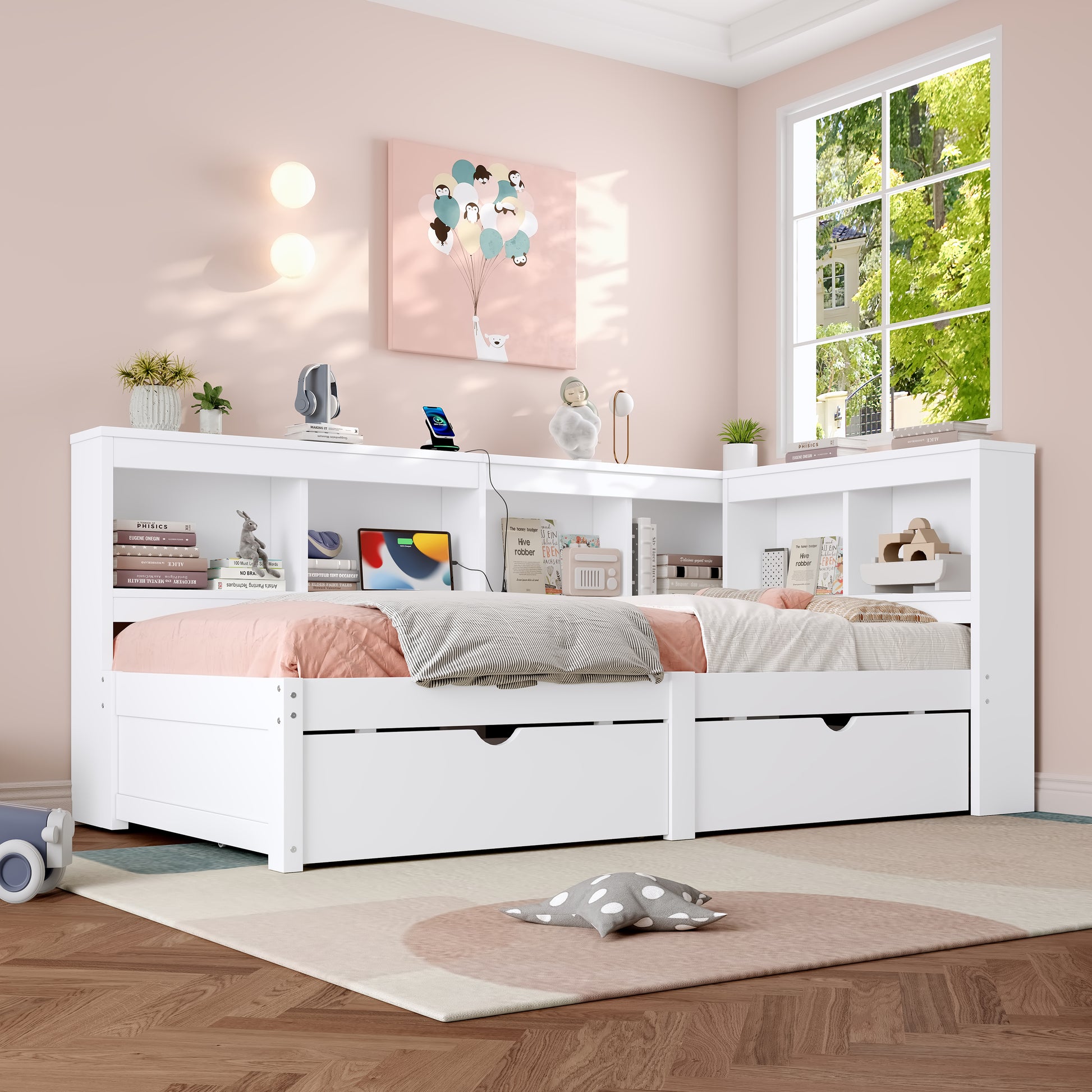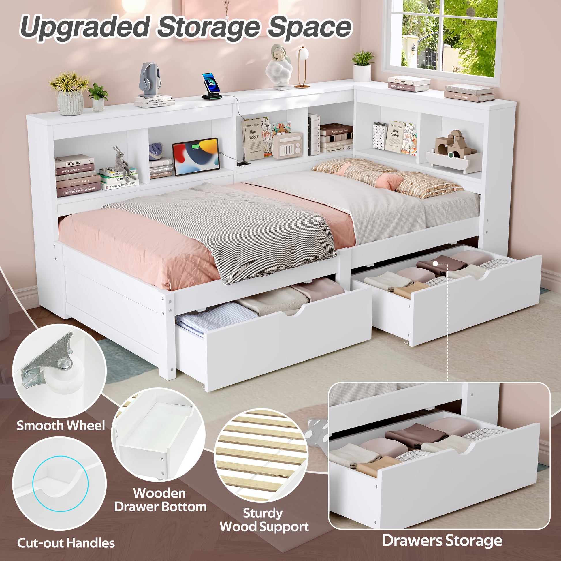 3ft Single L-Shape Daybed with Two Storage Drawers, Bookcase Storage, and Charging Station, Wood White