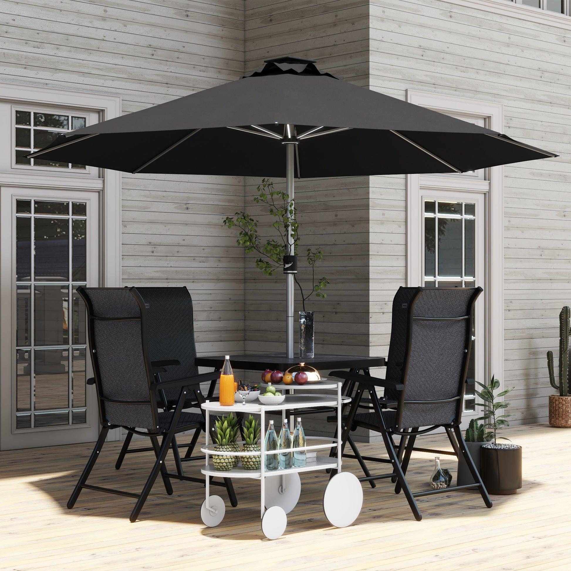 Adjustable LED strips illuminate the parasol umbrella, allowing you to switch between soft, warm, natural, and daylight white lighting.