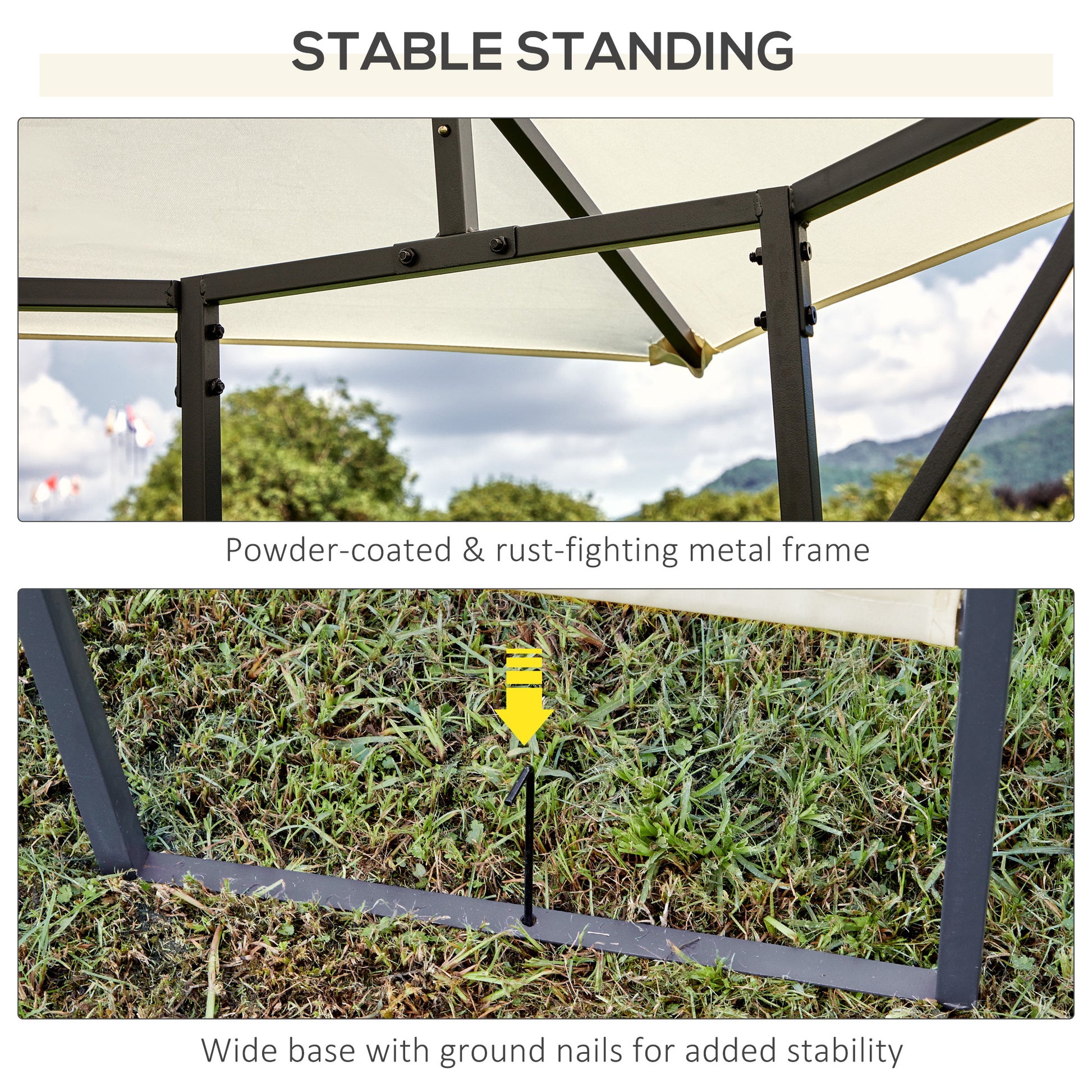 Solid and Stable Frame: The powder-coated steel frame features horizontal and slanted bars, making the garden gazebo sturdy and durable. It includes a reinforced top and 4 screws for increased stability.