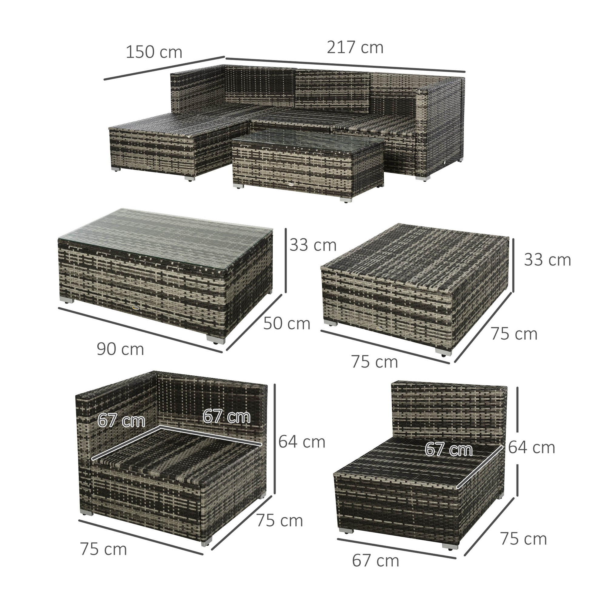 Dimensions: Middle Sofa Size: 75L x 67W x 64H cm; 2 x Corner Sofa Size: 75L x 75W x 64H cm; Stool Sofa Size: 75L x 75W x 33H cm; Tea Table Size: 90L x 50W x 33H cm. Weight Capacity: 160kg (Single Sofa, Stool Sofa), 70kg (Tea Table).