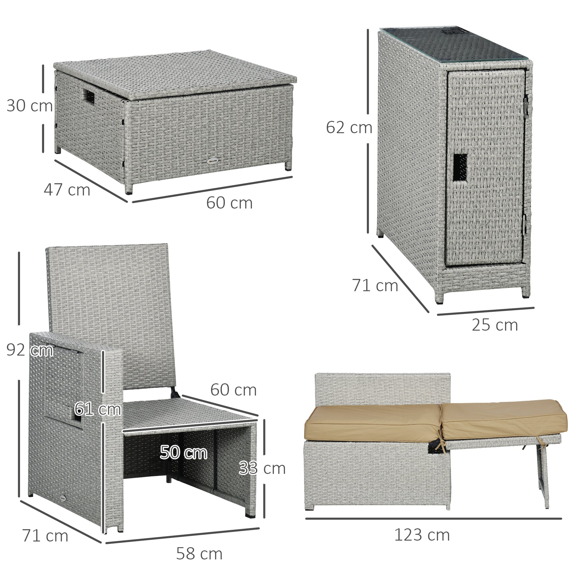 Dimensions: Chair: 90H x 71L x 58Wcm. Stool: 30H x 47W x 60Dcm, Table: 62H x 71L x 25Wcm. Assembly required.