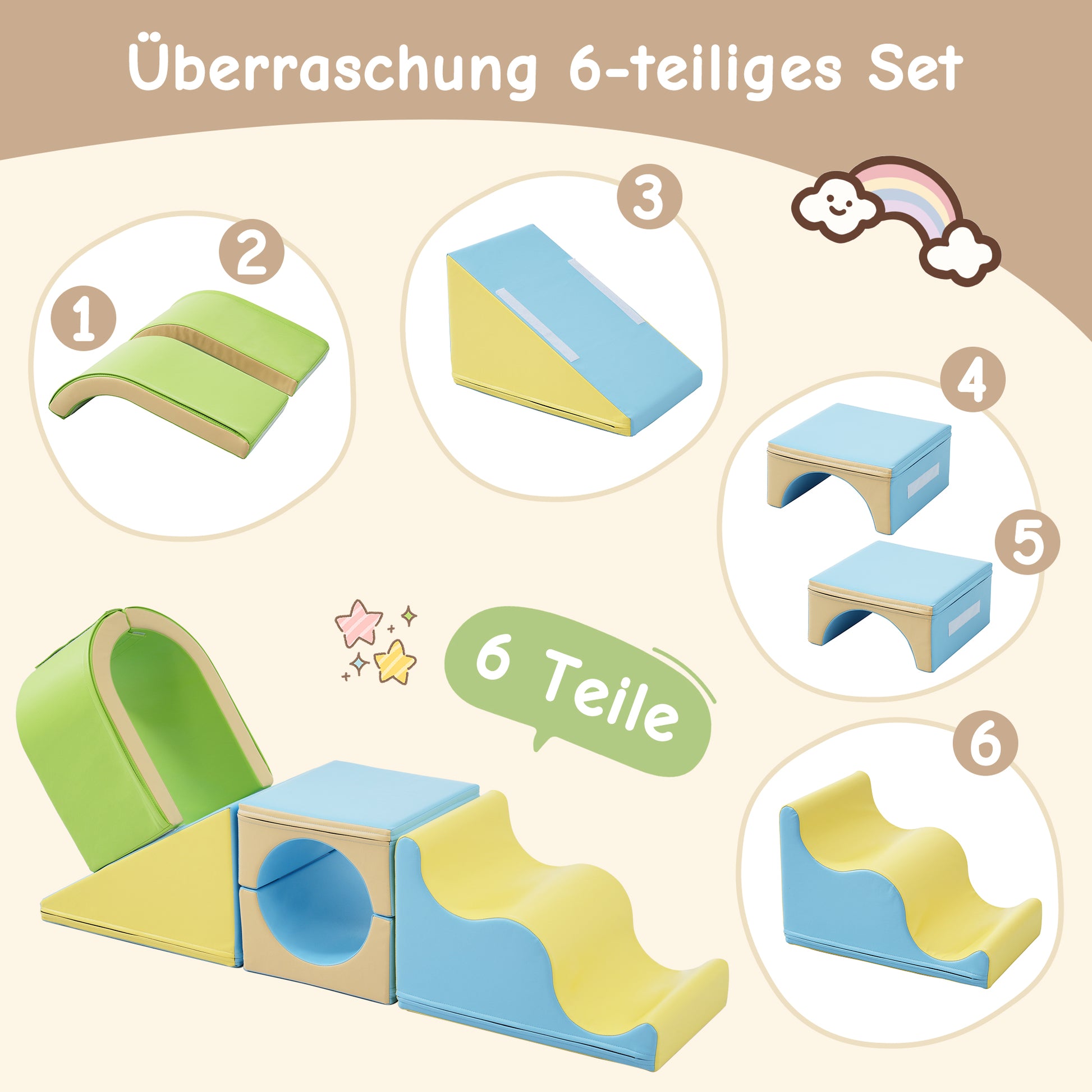 · Versatile 6-in-1 set: Offers endless play possibilities with freely combinable modules that can be used as climbing frames, slides, or crawling arches.