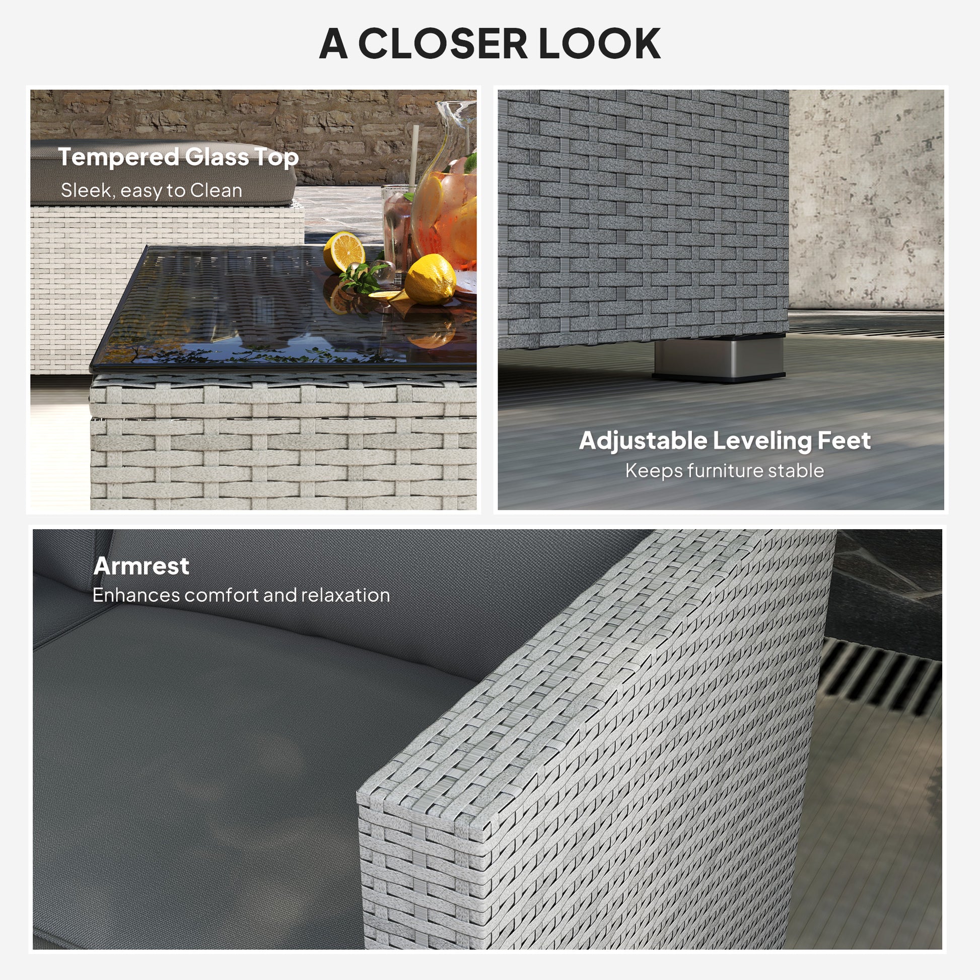 The garden corner sofa comes with a coffee table featuring a tempered glass tabletop for both style and ease of cleaning. The table provides a convenient place for books, drinks, sunglasses, or other items.