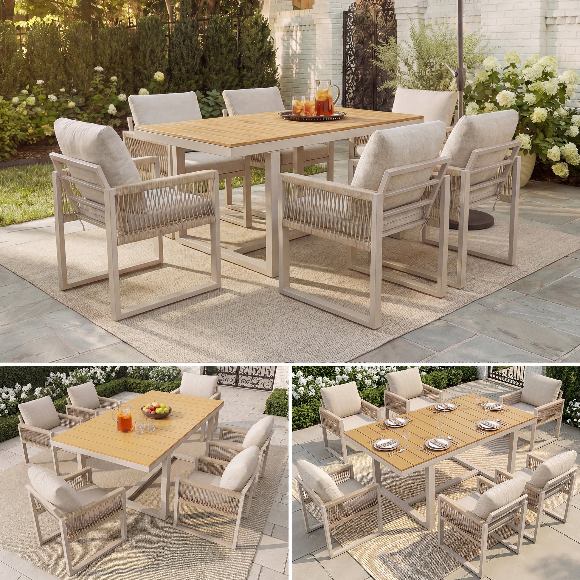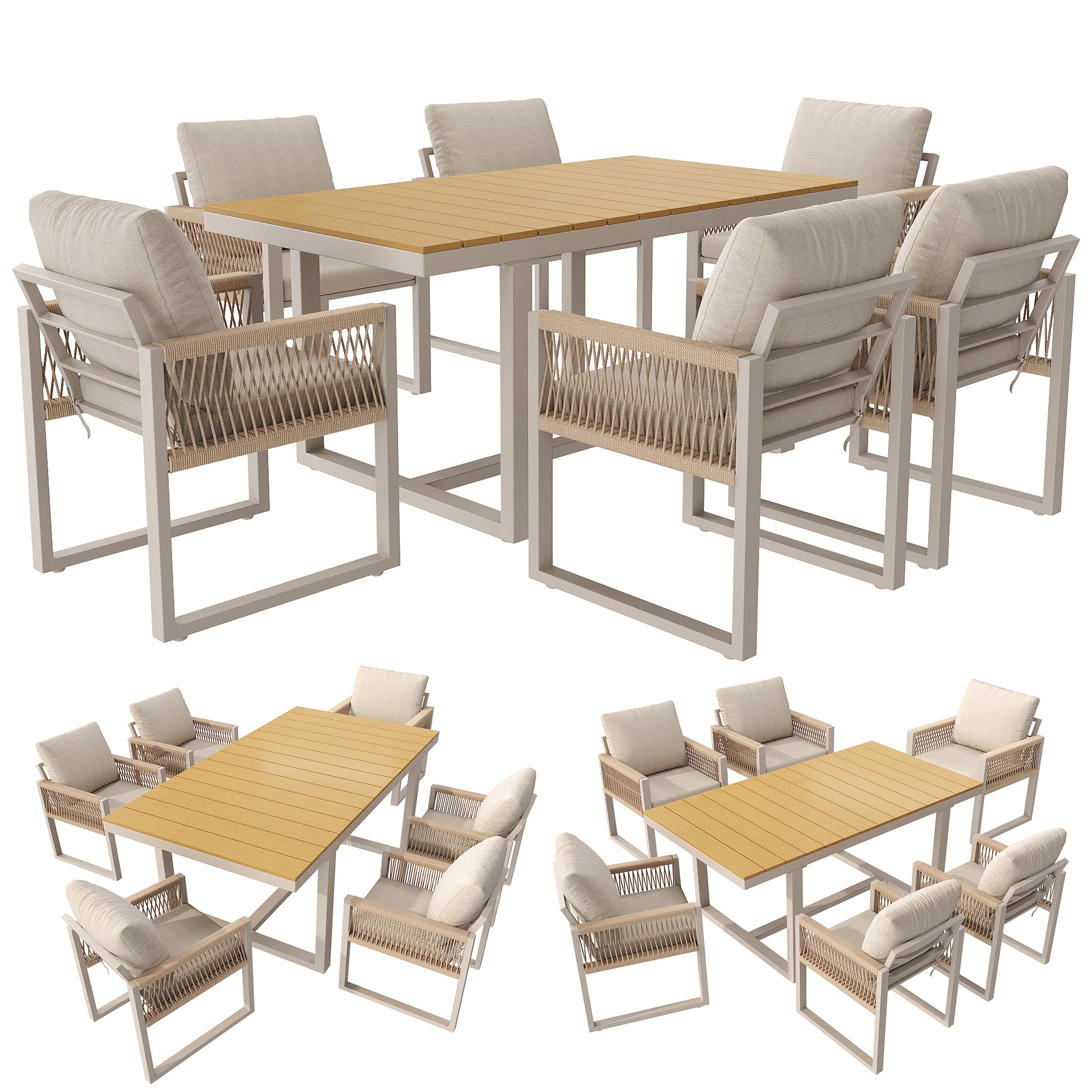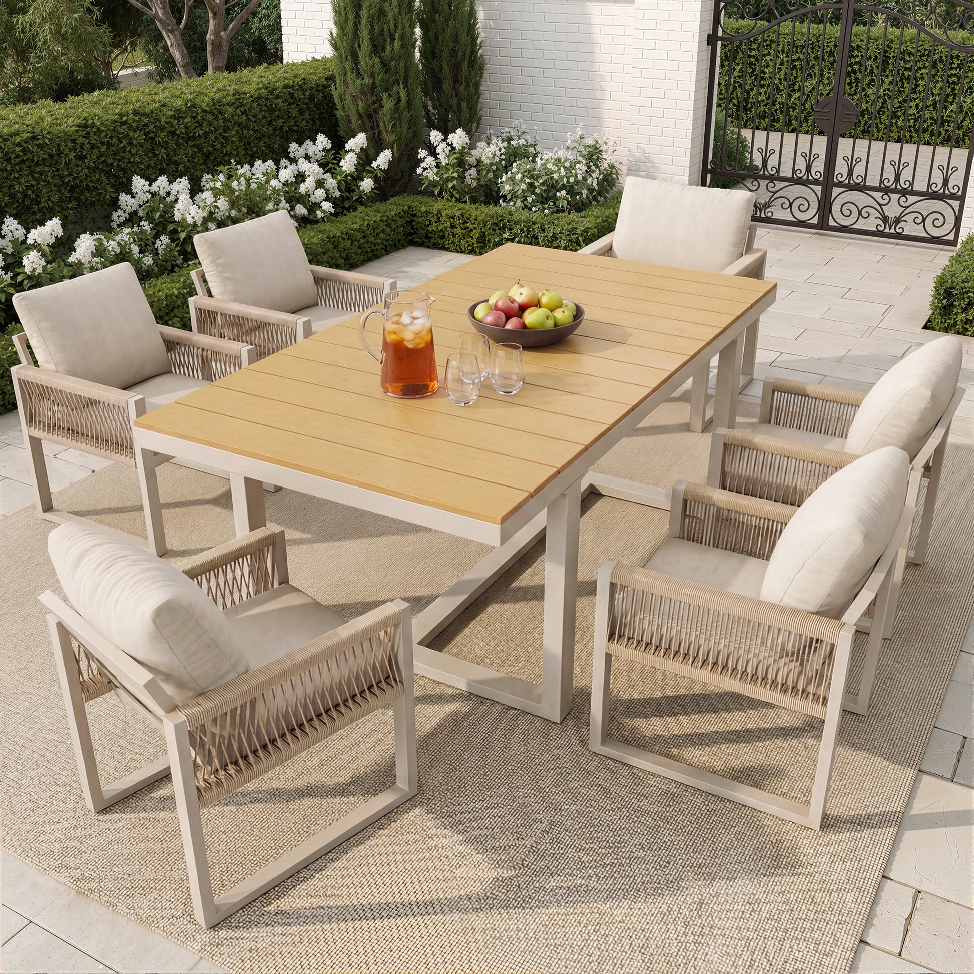 7-Piece Garden Dining Set with 1 Table and 6 Rope Weave Chairs, Weatherproof Cushions, Beige