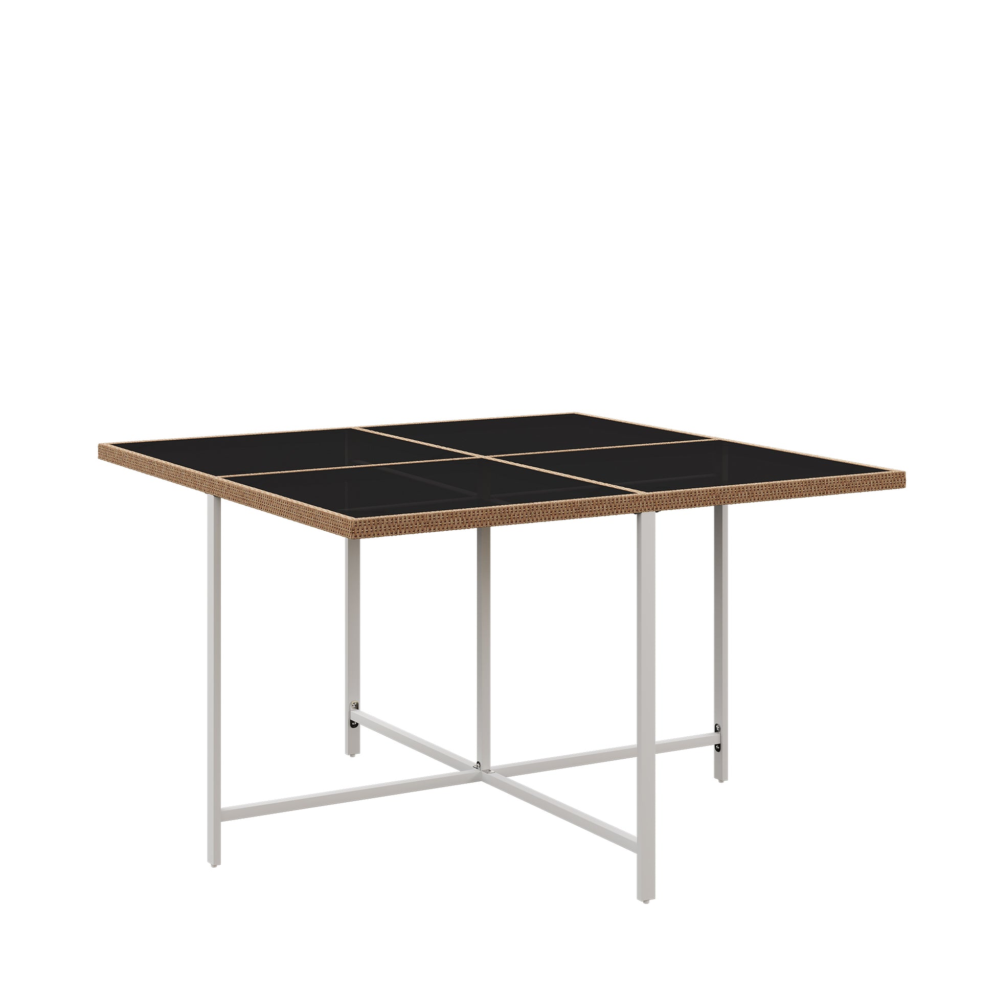 Built to last, the set features a galvanized steel frame for stability and durability, while also being sun and water resistant, making it perfect for use in any weather. The table features a black tempered glass top that is not only heat resistant but also adds a sleek, modern touch to your outdoor space. The table edges are wrapped in brown rattan, providing additional protection against impact and contributing to the overall visual appeal of the set. The chair armrests are wrapped in acacia wood, enhancing the aesthetic with a natural, rustic feel while also improving the durability of the furniture.