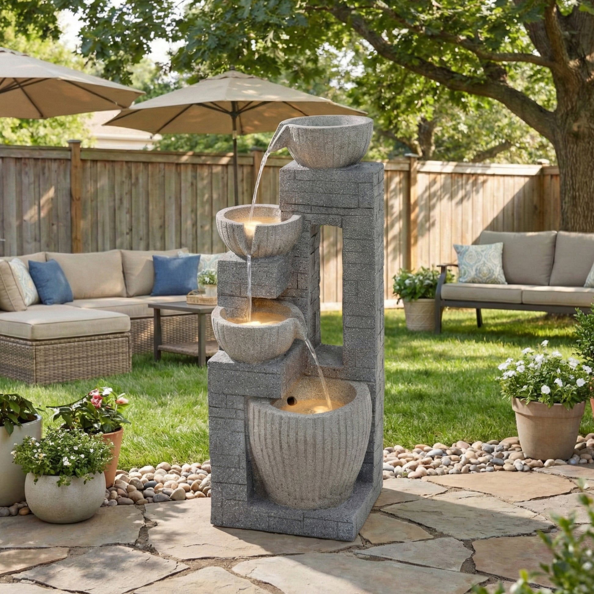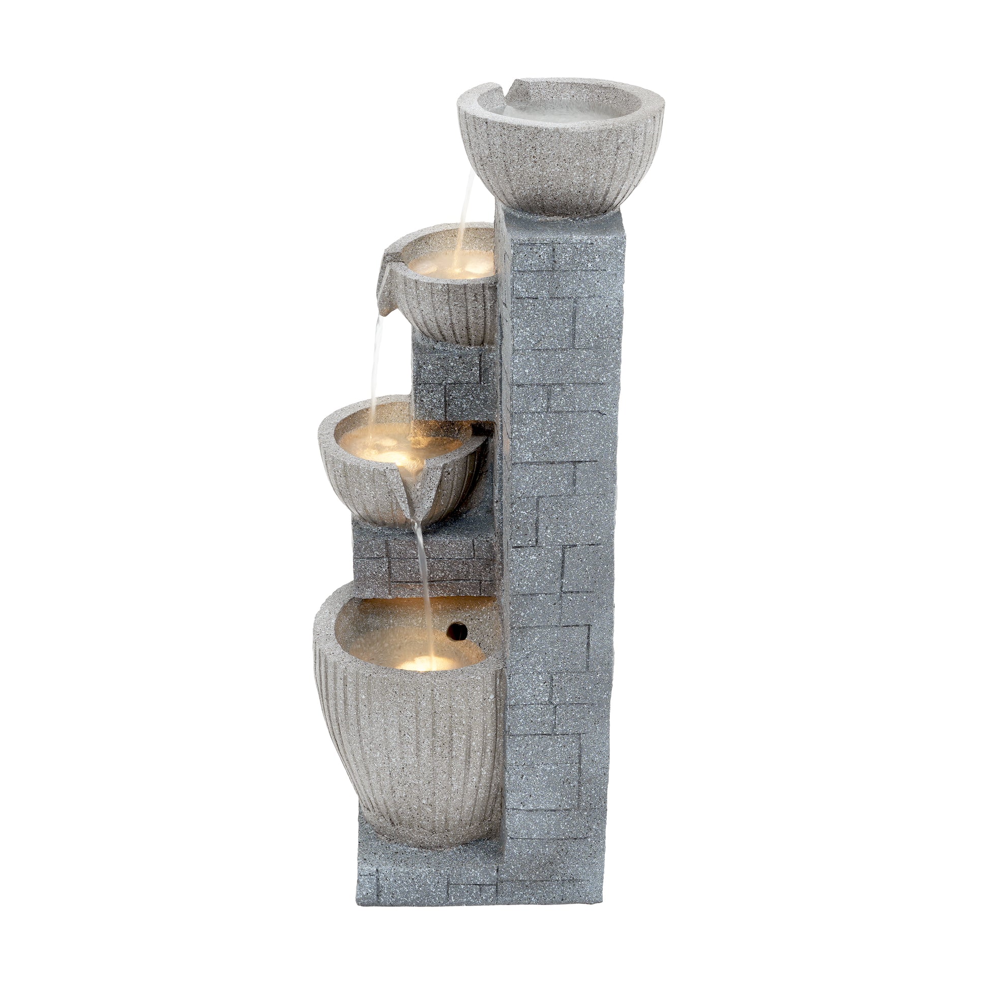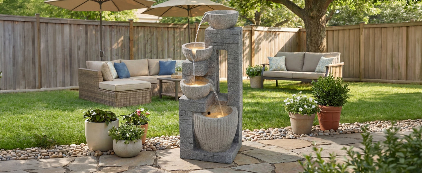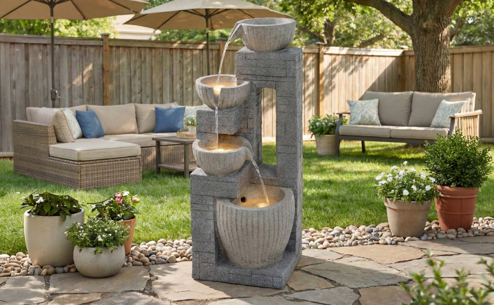 80 cm Layered Stone Basin with LED Fountain for Garden and Terrace, Stone Grey