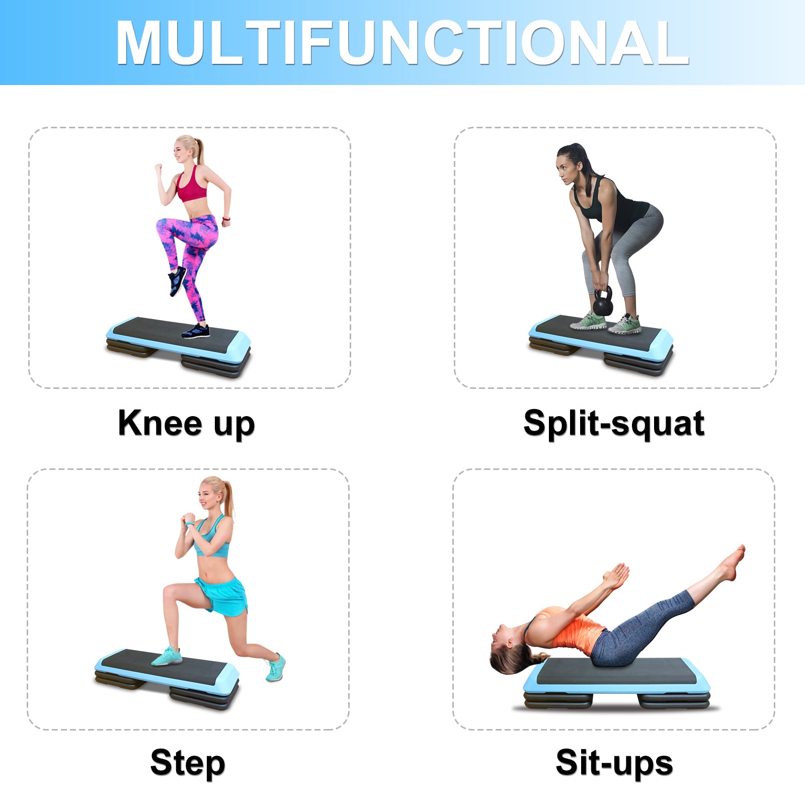 Versatile Applications: In addition to step routines, these step benches can be utilized for various exercises, including weight training and core strengthening. Target your hamstrings with alternating lunges, or strengthen your chest and back muscles with push-ups. It's perfect for Jump Step-Ups, Offset Push-up Crossovers, Squat-Pop Overs, Decline Mountain Climbers, and more.