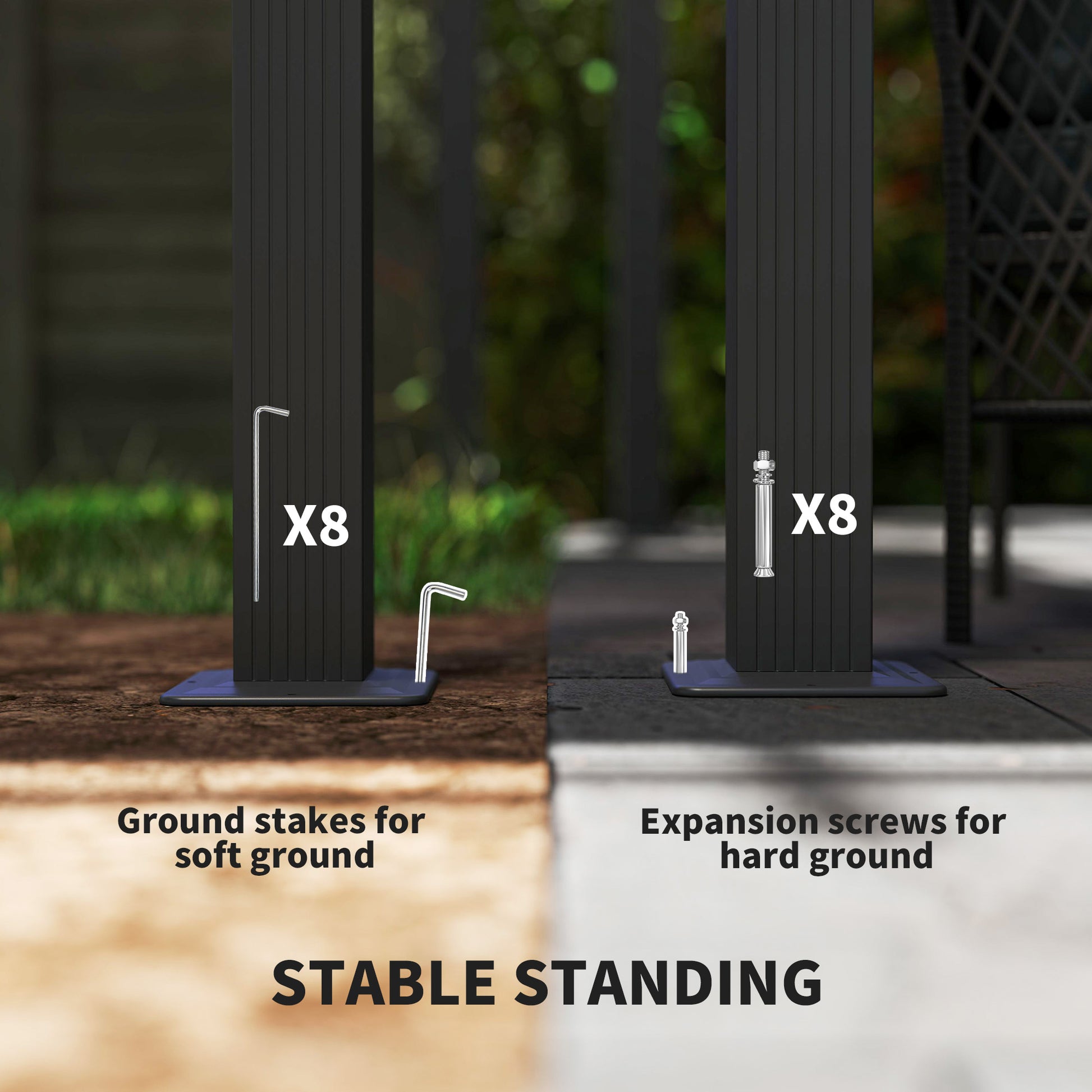 Aluminum Frame: Featuring a strong and rust-resistant structure, this pergola kit stands steady in place. Eight ground nails and eight expansion screws are included for secure ground attachment.