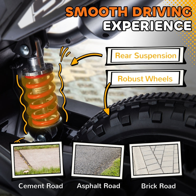 Two 12V motors: With a top speed of 6km/h, this kids ride-on bike offers up to an hour of fun on a single charge. The power display shows the battery level, so you can always charge it in time.