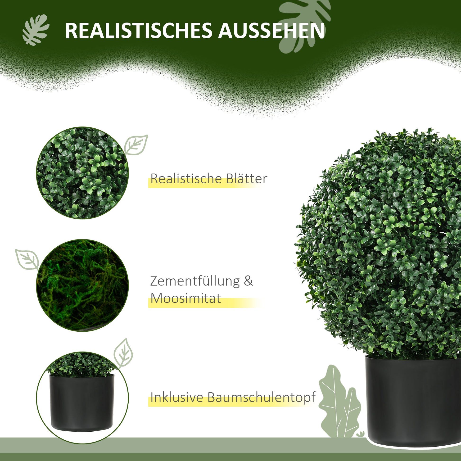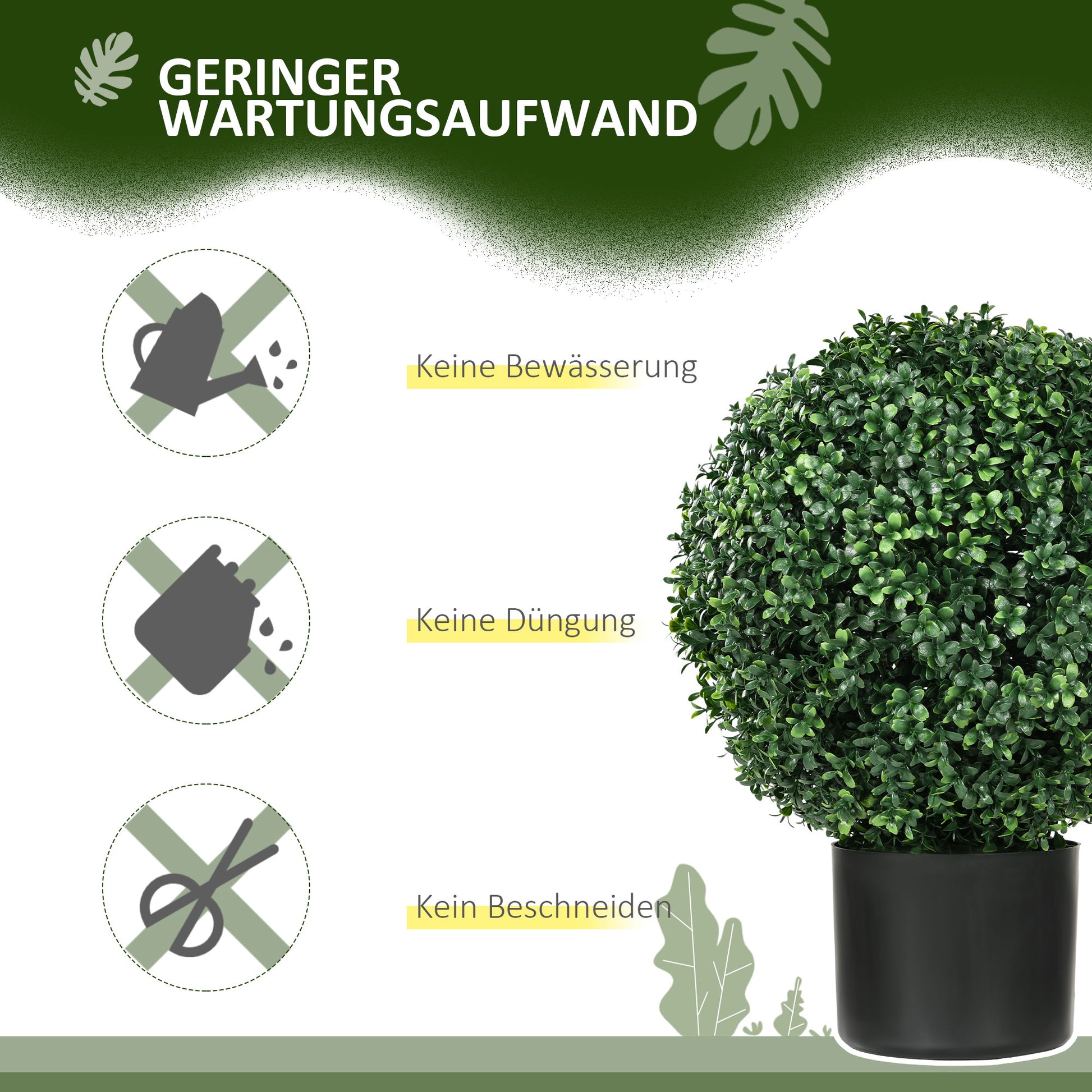 Information: The total height is 52 cm, and the spherical bush size is Ø40 cm. They are pre-assembled for convenience; simply stretch out the branches and leaves to achieve full, lifelike foliage.