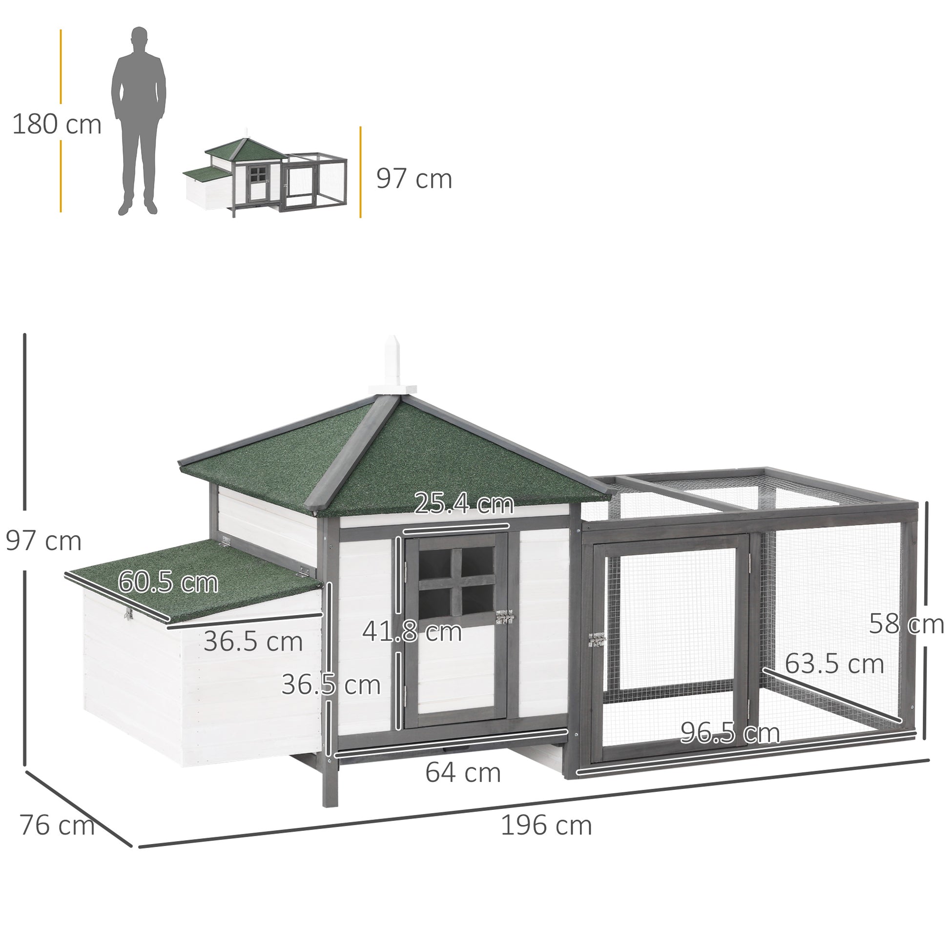 Bantam Chicken Coop with Run, Perches, Nesting Box, Pinewood, Grey+White