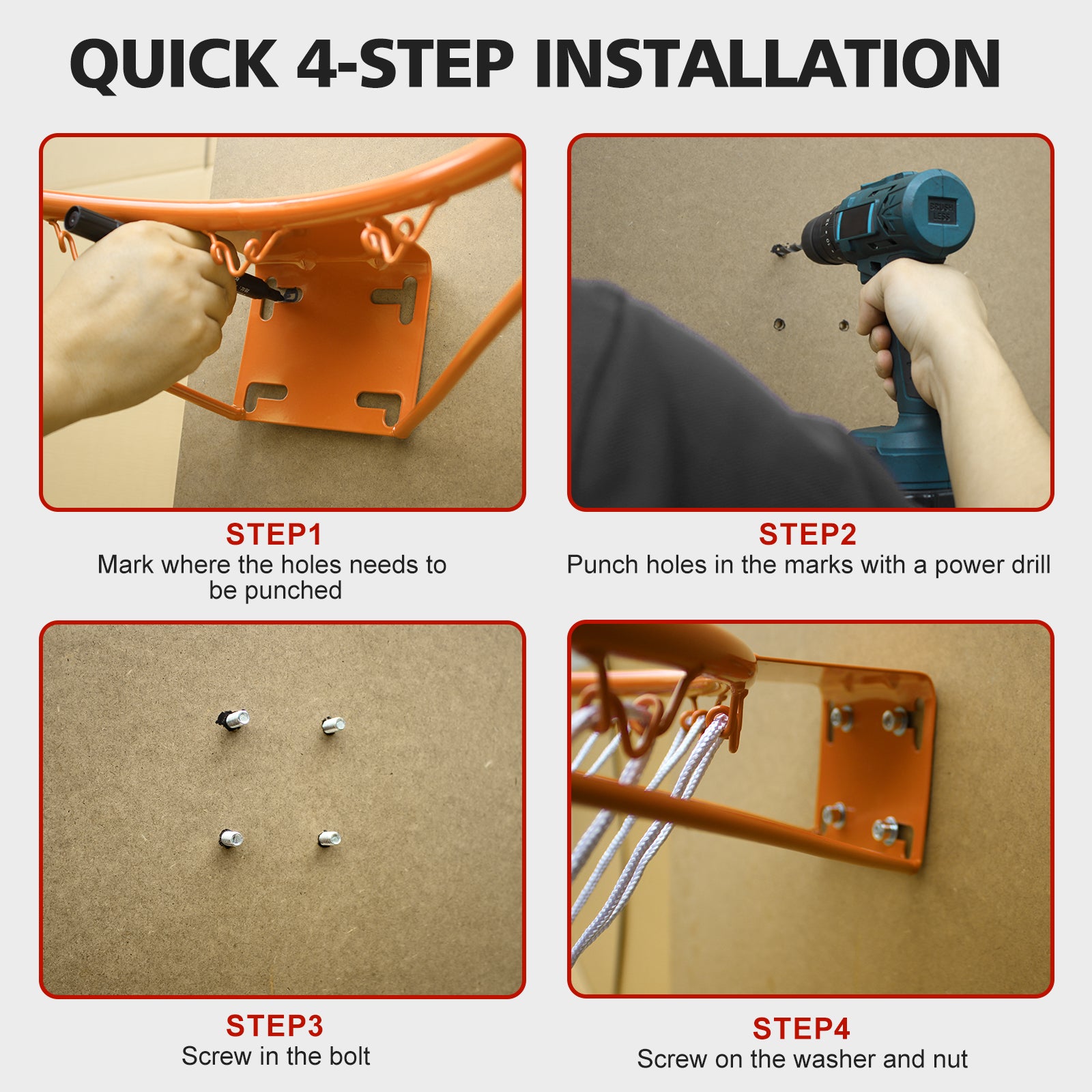 This wall mounted basketball hoop is easy to install and doesn't require professional installers. You can follow these four simple steps: First, mark the positions of the four installation holes. Second, drill holes using nails or a drill. Third, screw in the expansion bolts into the holes. Fourth, install the basketball hoop. It takes just a few minutes to complete assembly.