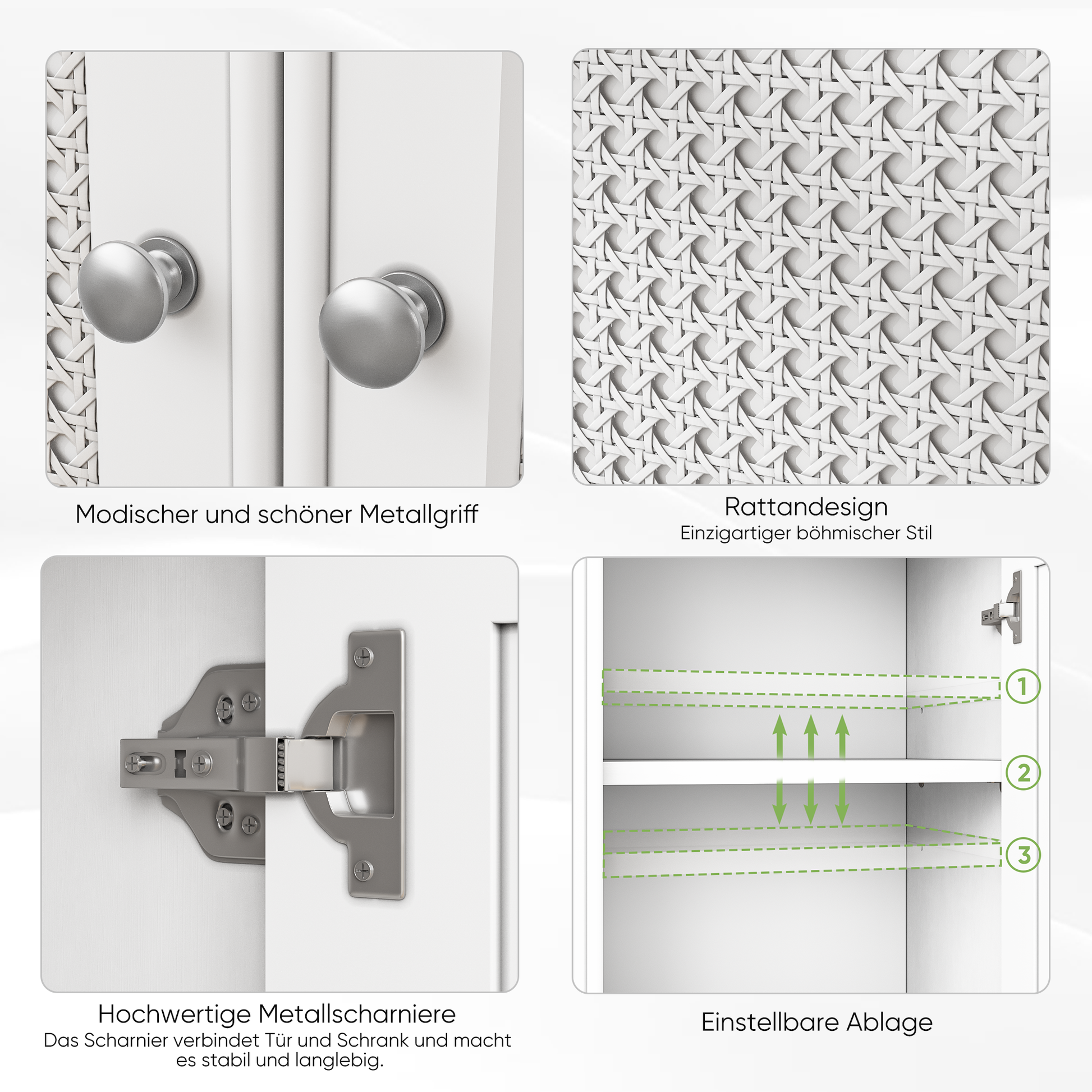 Combining modern style with bohemian rattan elements, this bathroom floor cabinet features ample storage space and movable panels inside. It is a great choice for your living room, bathroom, and kitchen.