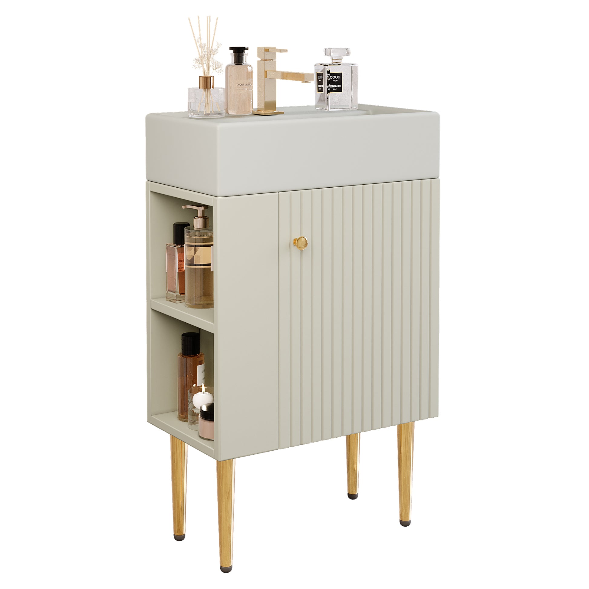 The integrated countertop design is not only beautiful and spacious but also easy to clean, eliminating tedious cleaning steps and allowing you to easily enjoy a clean and hygienic bathroom environment. The compact bathroom cabinet is perfect for small bathrooms and can also be used as a washbasin, making perfect use of limited space, functional, and beautiful.