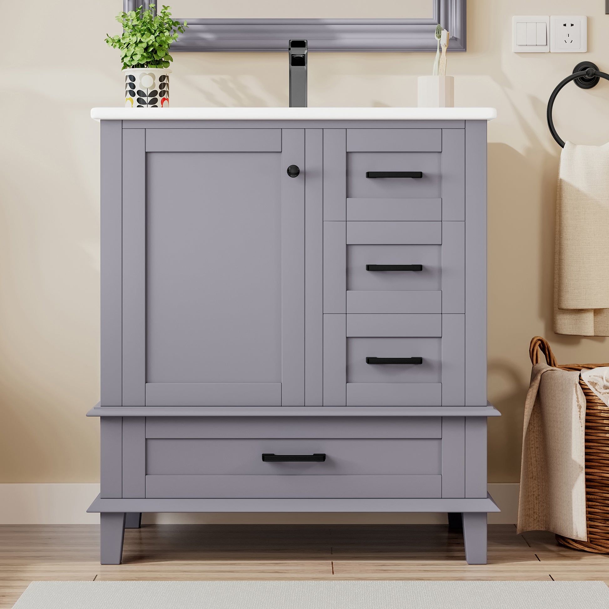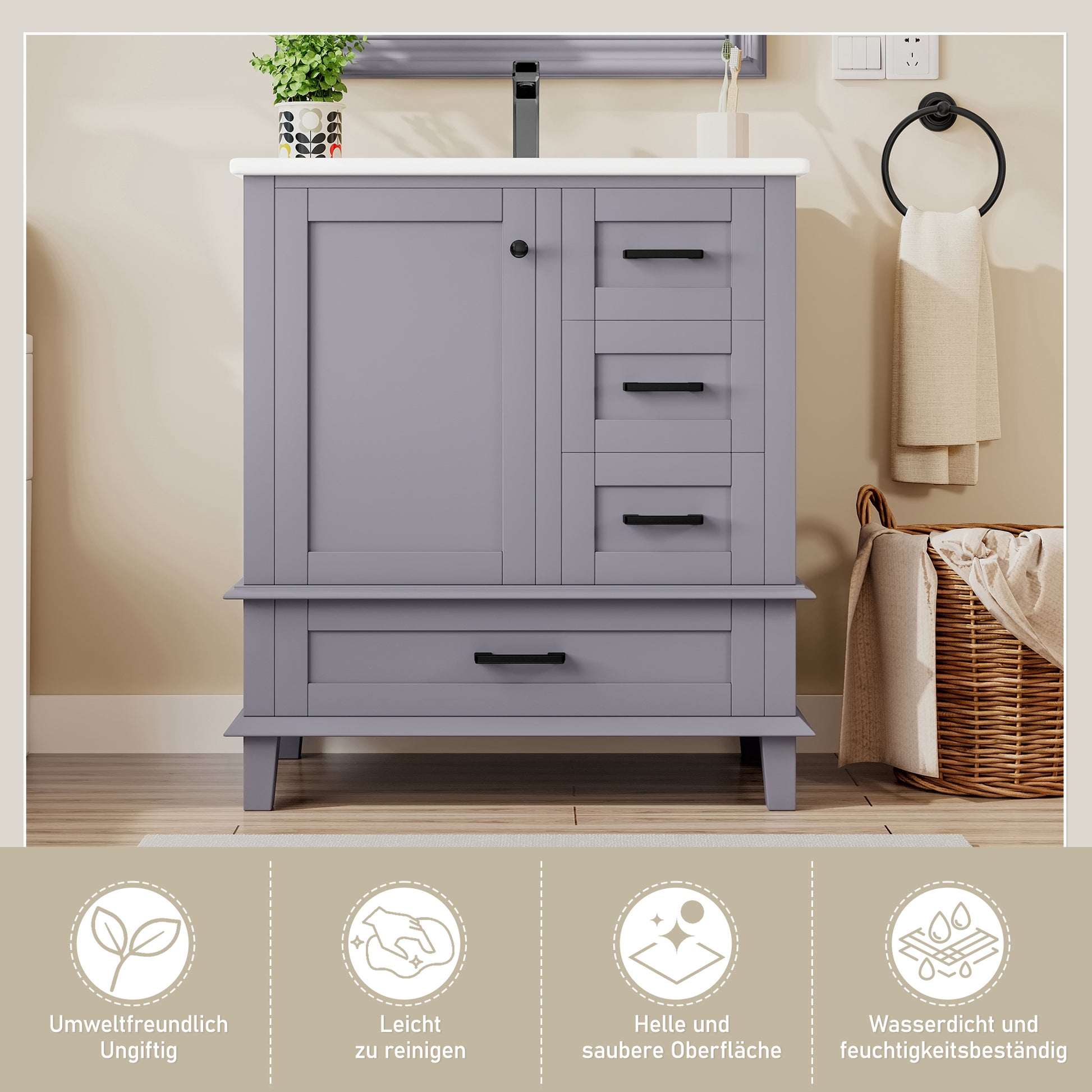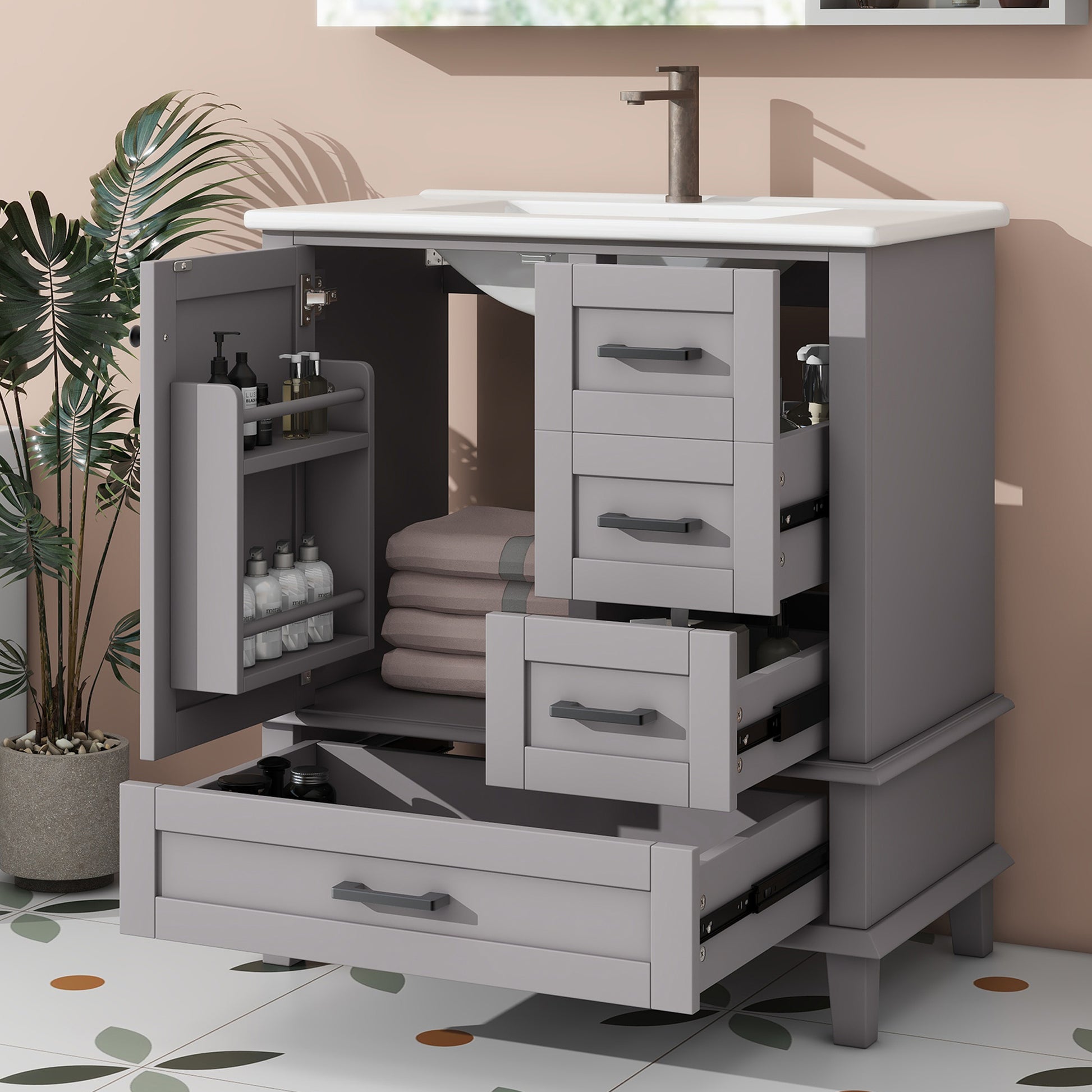 Bathroom Vanity Unit with Ceramic Sink and Silent Storage Drawers, Grey