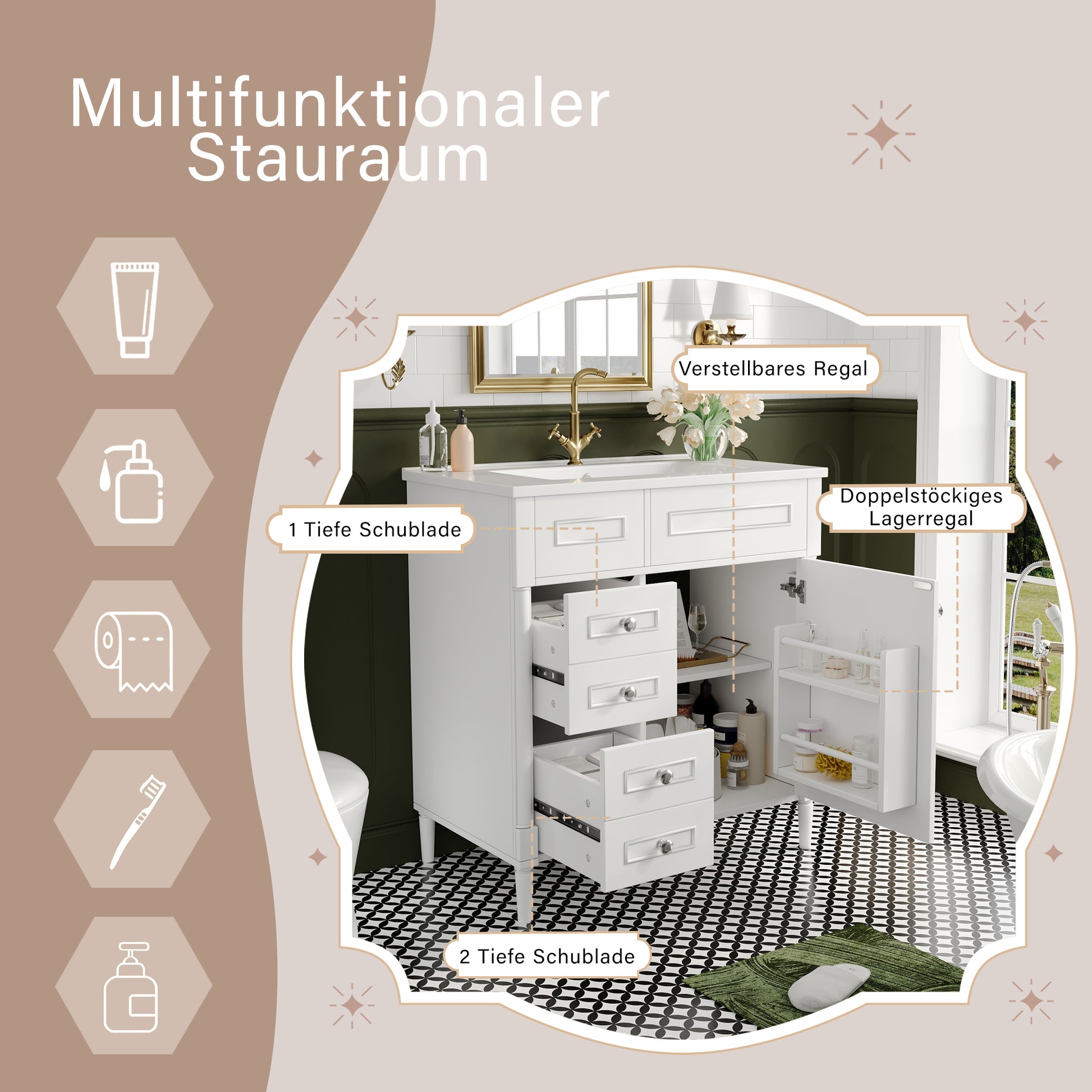 More than just a washbasin, this piece of furniture is a well-designed storage system that brings order and efficiency to your bathroom. The flexible interior layout, with an adjustable shelf and two fixed shelves, allows for customized organization of towels, toiletries, cosmetics, and accessories. The spacious drawer offers discreet storage for personal items. This intelligent space allocation eliminates clutter and creates a calming, uncluttered atmosphere. Combined with the practical, pre-drilled installation of the ceramic basin and the clean design, daily use becomes a comfortable experience. It is a holistic solution that offers not only style but also genuine practical improvements for everyday bathroom life.