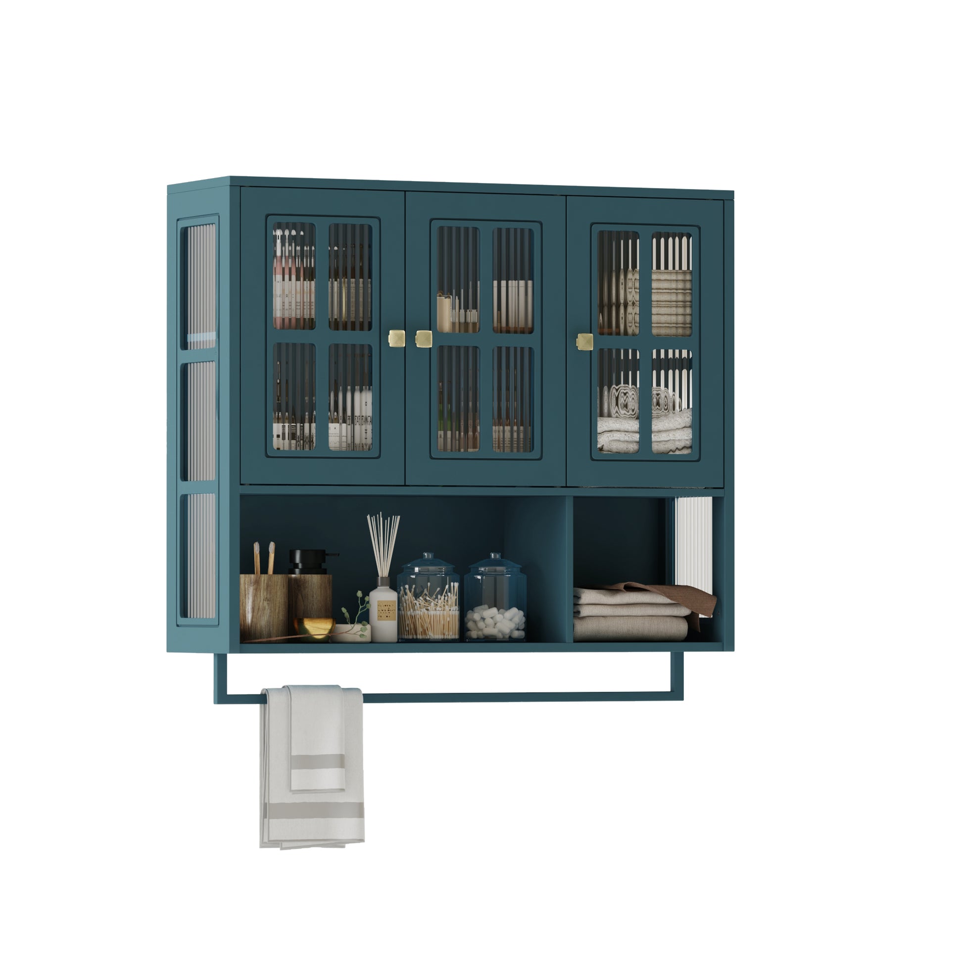 Bathroom Wall Cabinet 3-Door Wooden Glass Door Towel Bar - Dark Green