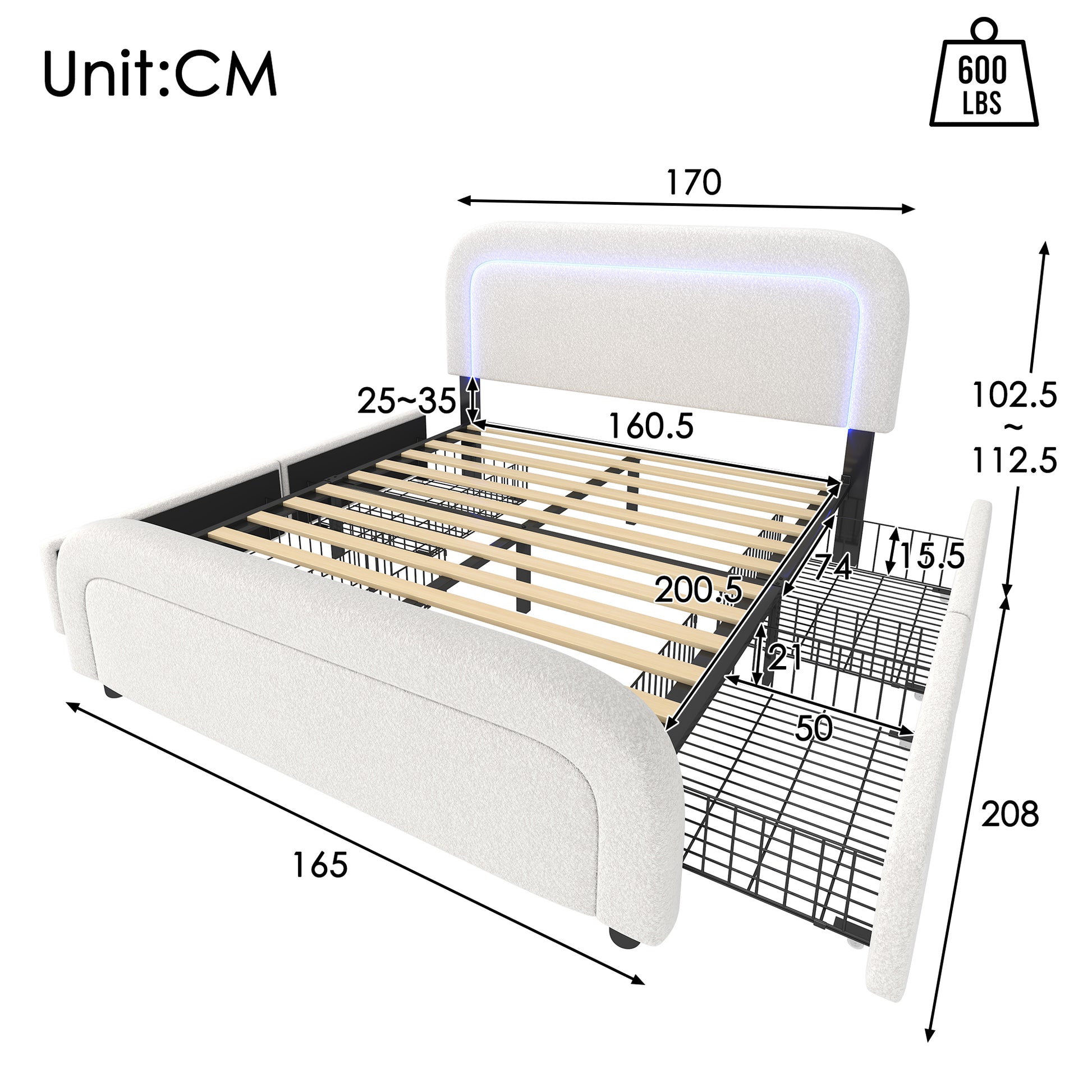 Bed Frame 160x200cm Upholstered LED/USB-C Charging Storage Sherp White