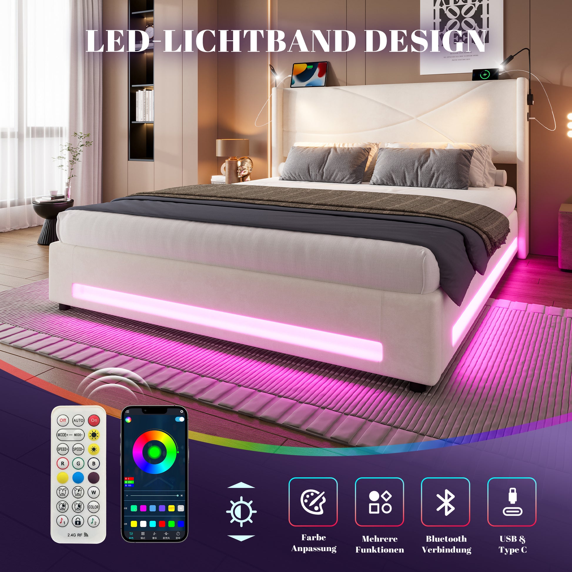 Bed Frame, Modern with Reading Lights, LED, Hydraulic Storage, USB Ports, 140x200cm