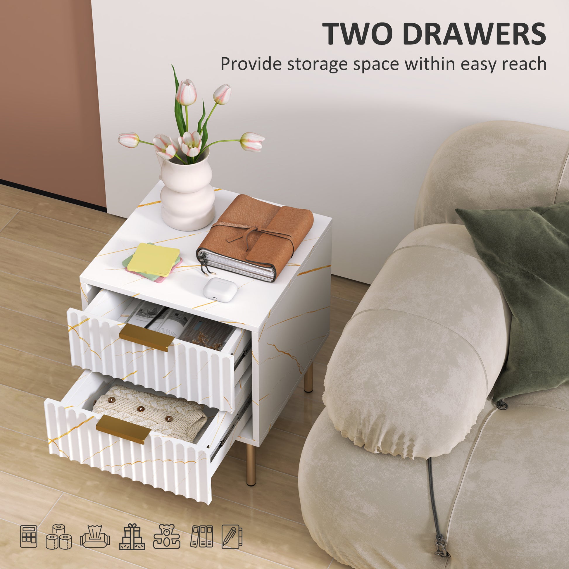Two drawers: White bedside table offers storage for your the bedtime essentials. Keep items conveniently close to your bed.
