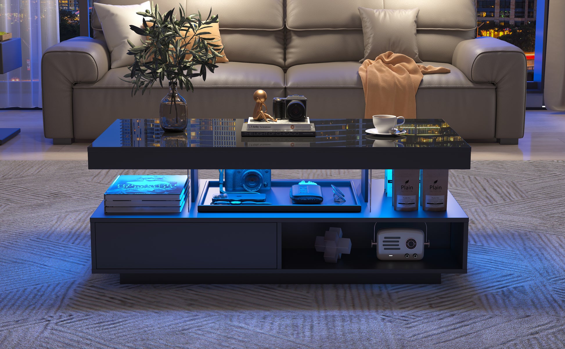 Press to Open: The coffee table's two drawers are designed to be conveniently and quickly opened with a push of a button.