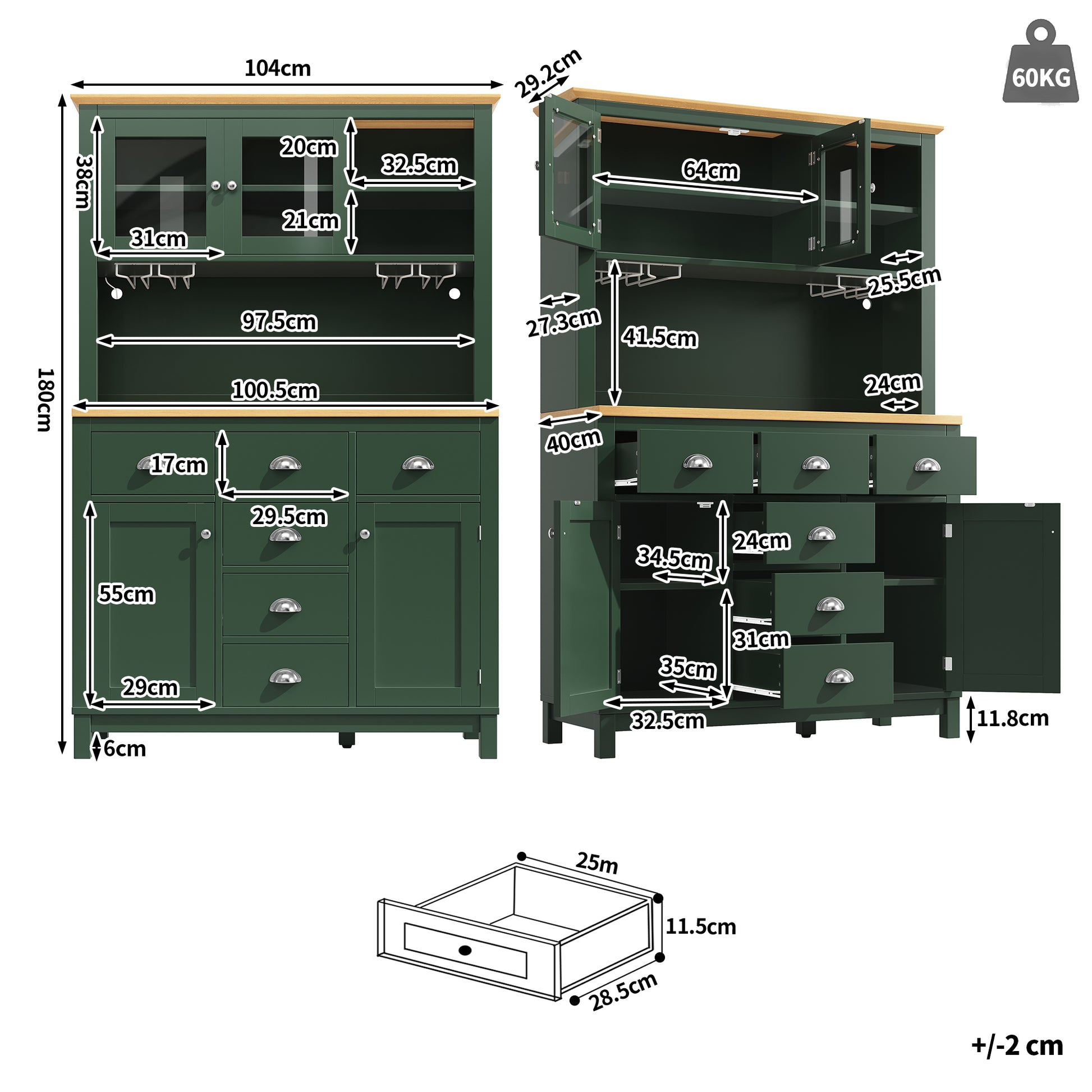 The sideboard measures 104 cm long, 40 cm wide, and 180 cm high, offering ample storage space.