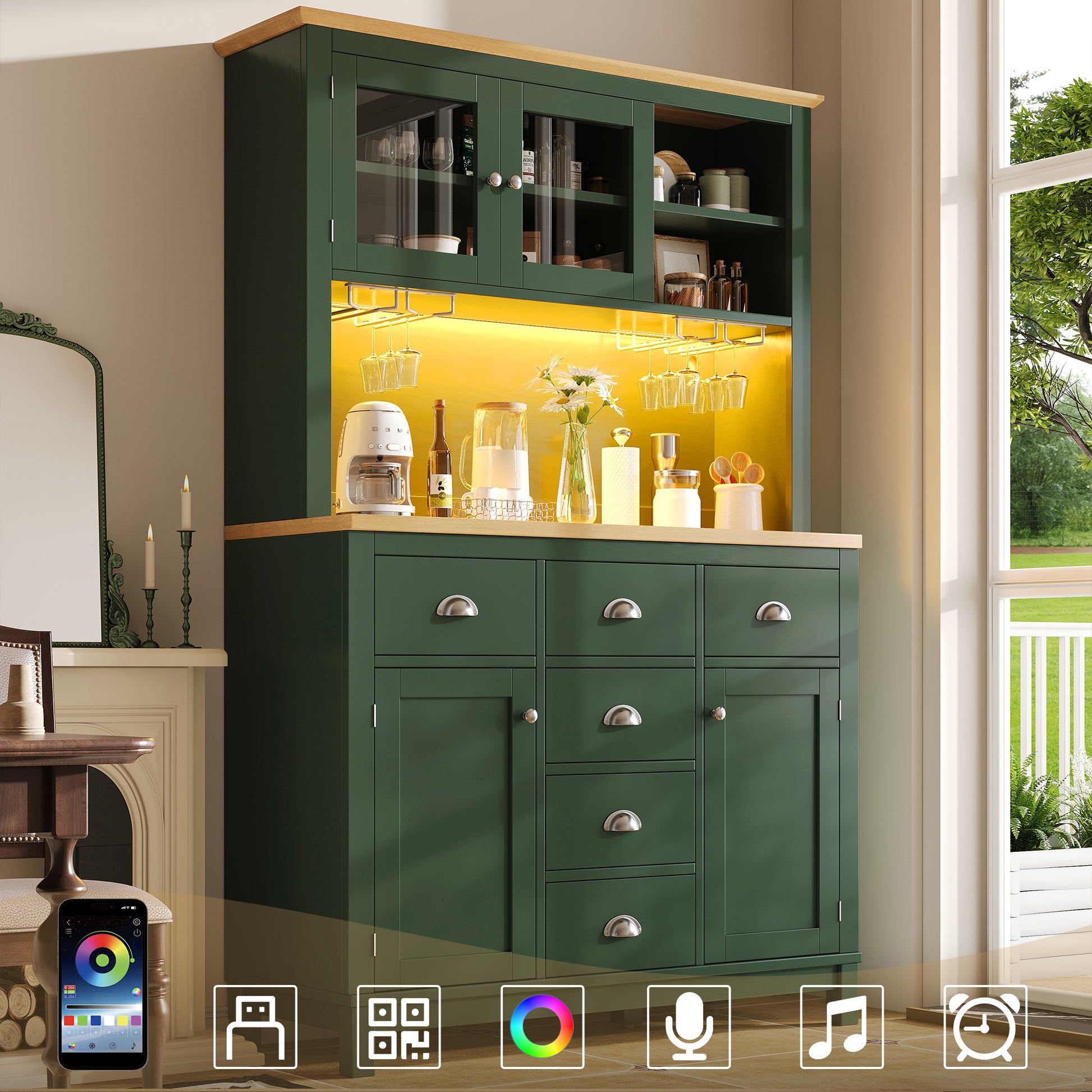 Buffet Sideboard Cabinet with 4 Doors and LED Lights, Green and White