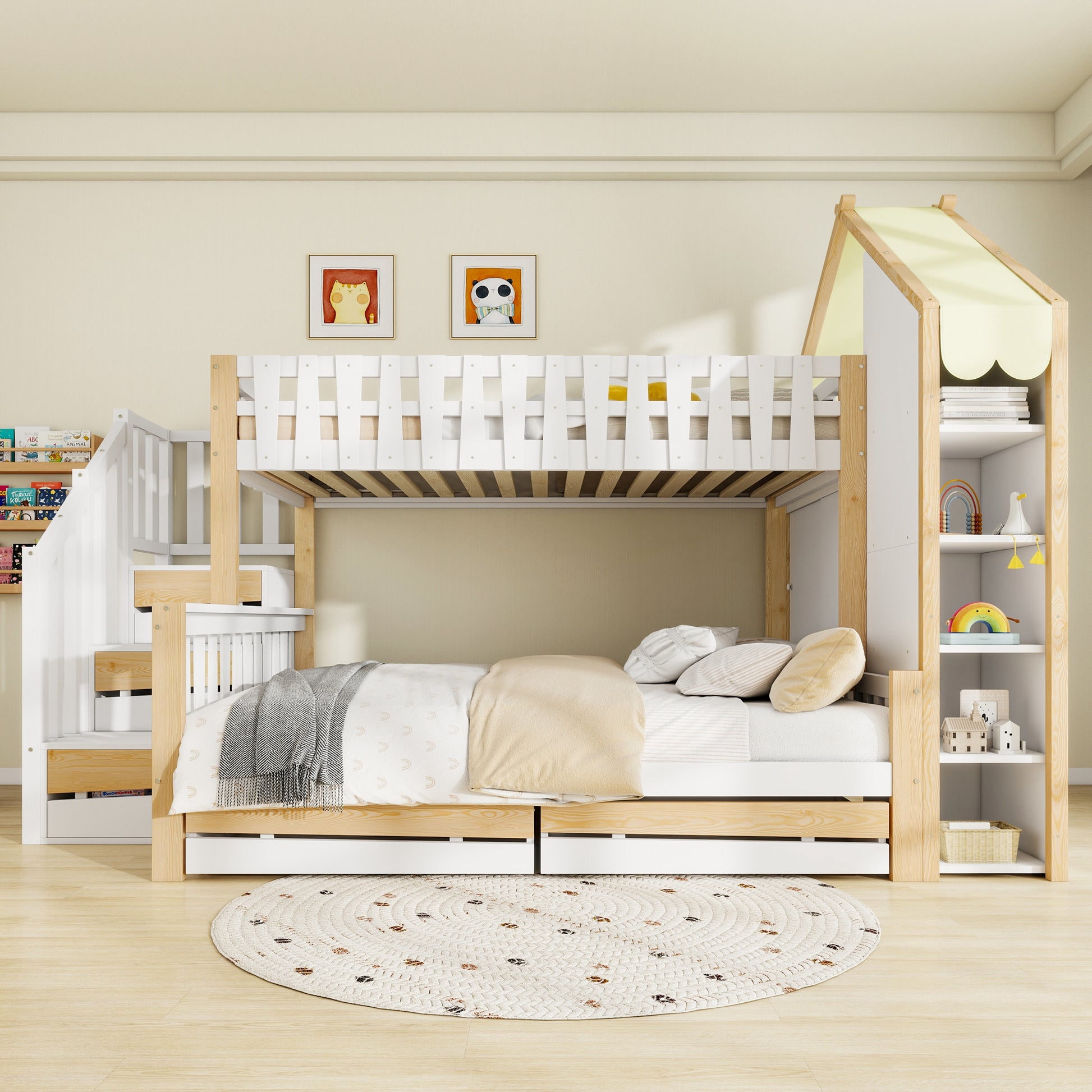 It includes a well-designed triple storage system: integrated drawers on the stairs side, open compartments on the house side, and two additional drawers under the bed, providing ample space for toys, books, and clothes. With multiple size options, a spacious under-bed storage area, and adjustable elements to accommodate different growth stages, this bed combines safety, practicality, and childlike charm in an ideal piece of children's bedroom furniture.