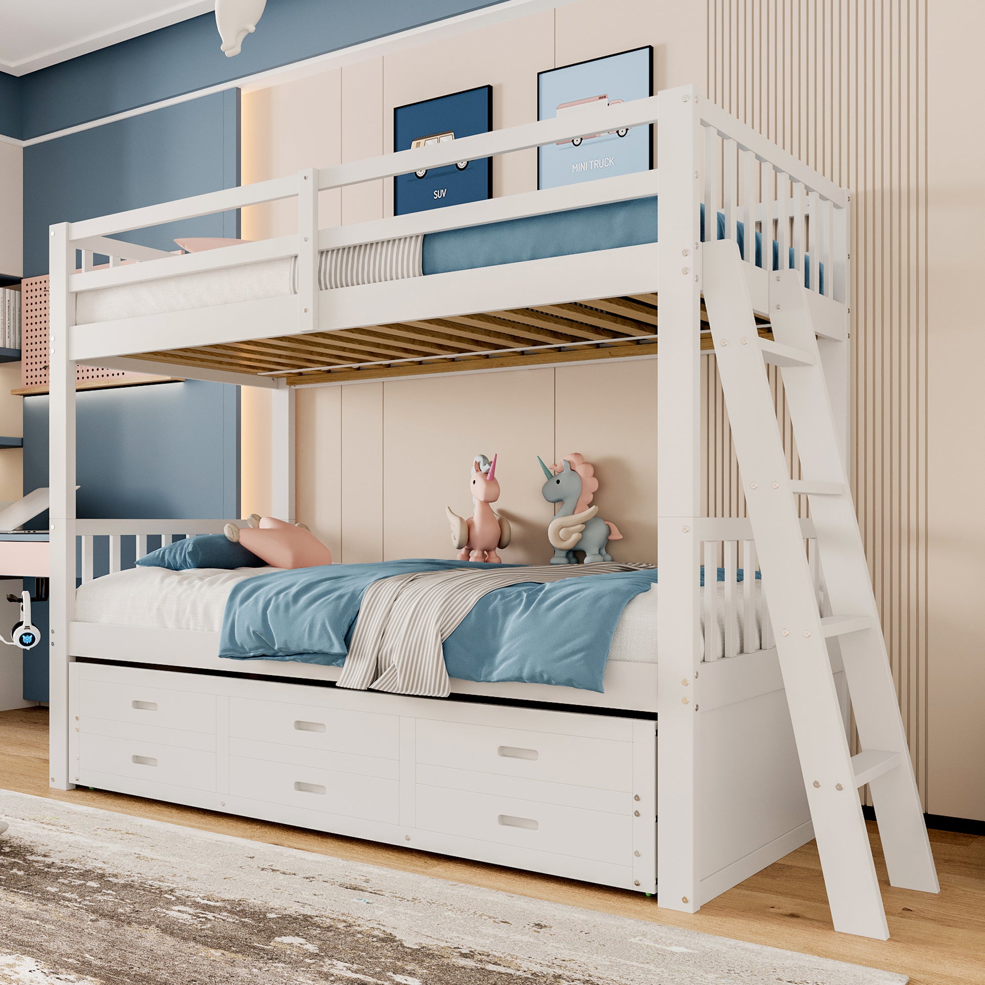 The bunk bed features three large drawers on the lower level, perfect for storing children's toys and clothes, helping to keep the room tidy. This multifunctional bunk bed is flexible and versatile, creating a cheerful little world for children. The bed is surrounded by sturdy rails with a non-slip stair design, providing all-around protection for your child's safety and giving parents peace of mind. Its simple and stylish design is anything but ordinary, being both practical and beautiful, adding warmth and elegance to any child's room. A truly worthwhile addition.