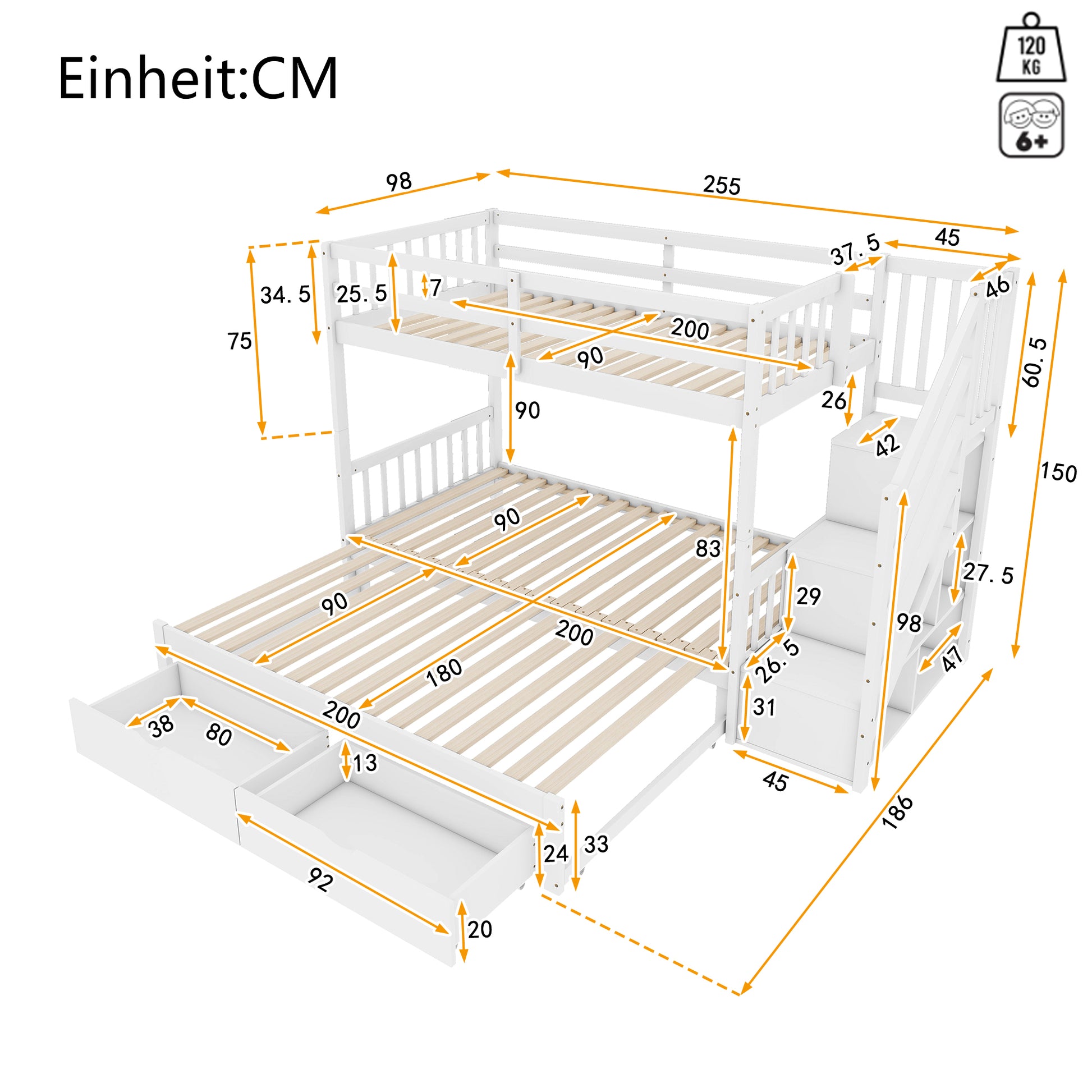This solid pine bunk bed set, complete with slatted base, headboard, and footboard, is the perfect choice for a traditional style in your room. Bunk beds are great for saving space in your bedroom while also providing practical storage. The integrated stairs with storage compartments are perfect for storing small items. The included pull-out bed is ideal for sleepovers and can also be easily converted from a single bed to a 180 x 200 cm bed, offering unlimited possibilities in a small space. Two drawers make it easy to organize and store your belongings, keeping your bedroom neat and tidy. Choose this bed to enjoy a comfortable night's sleep and showcase your taste and style, breathing new life into your bedroom.