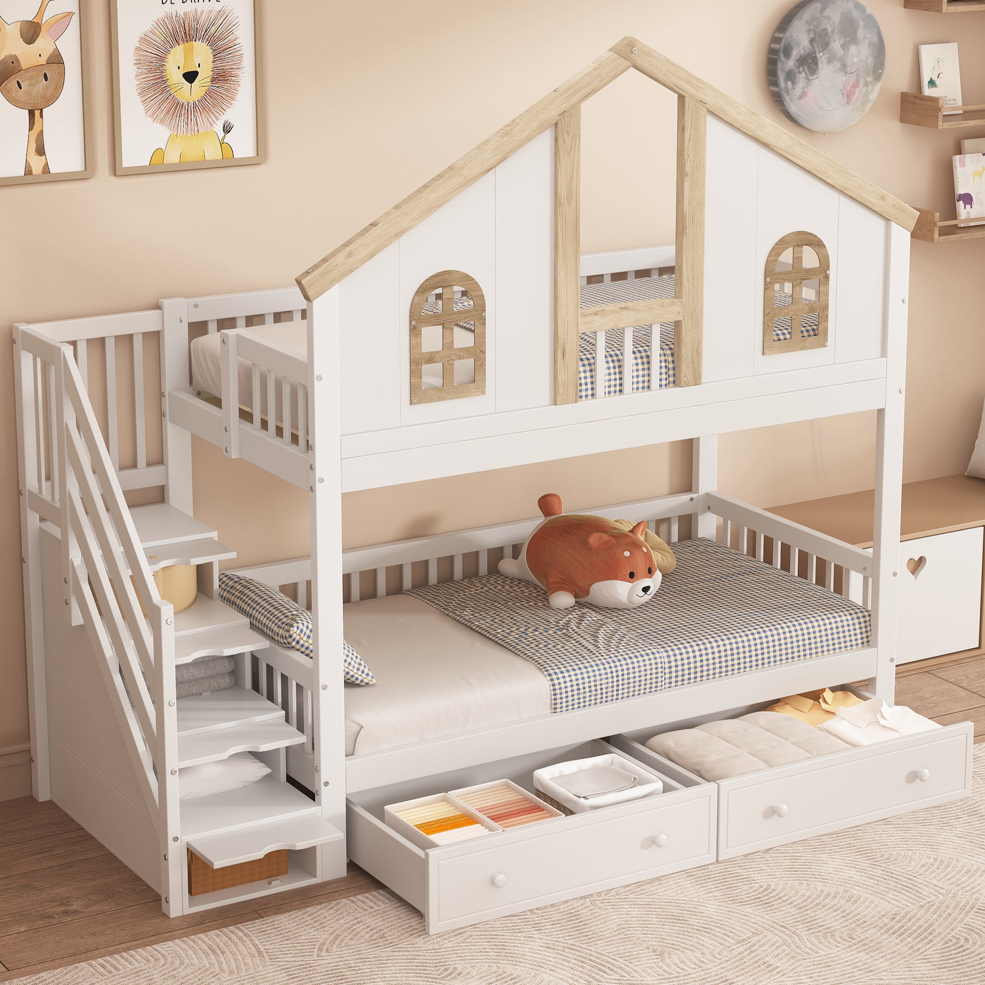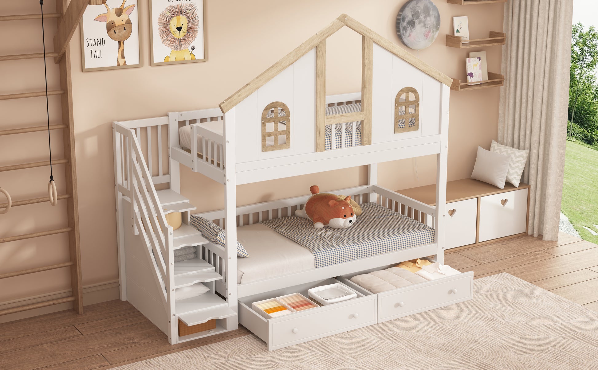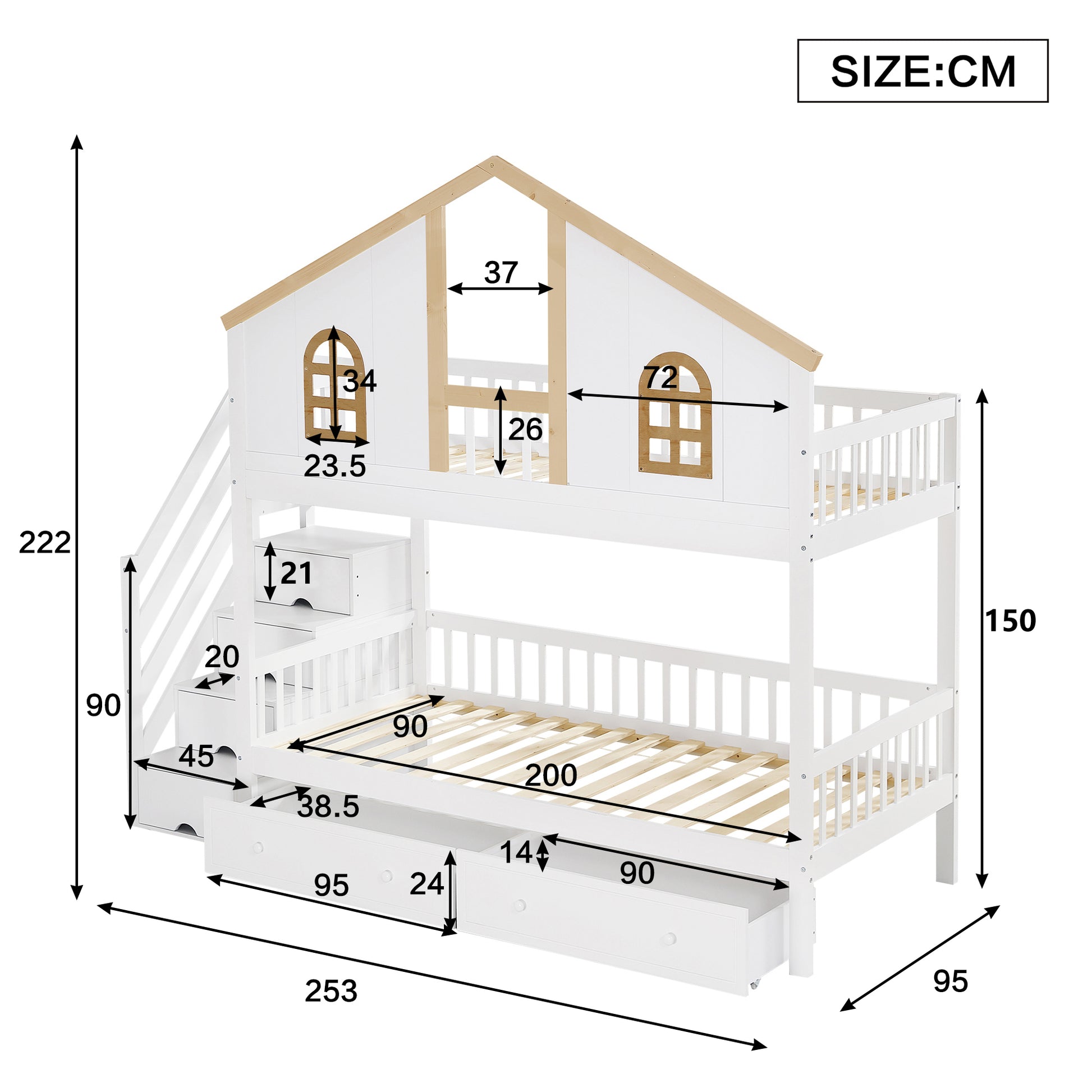 Bunk Bed, Children's with Safety Gate, Drawers & Storage Stairs, Pine+MDF, White+Natural