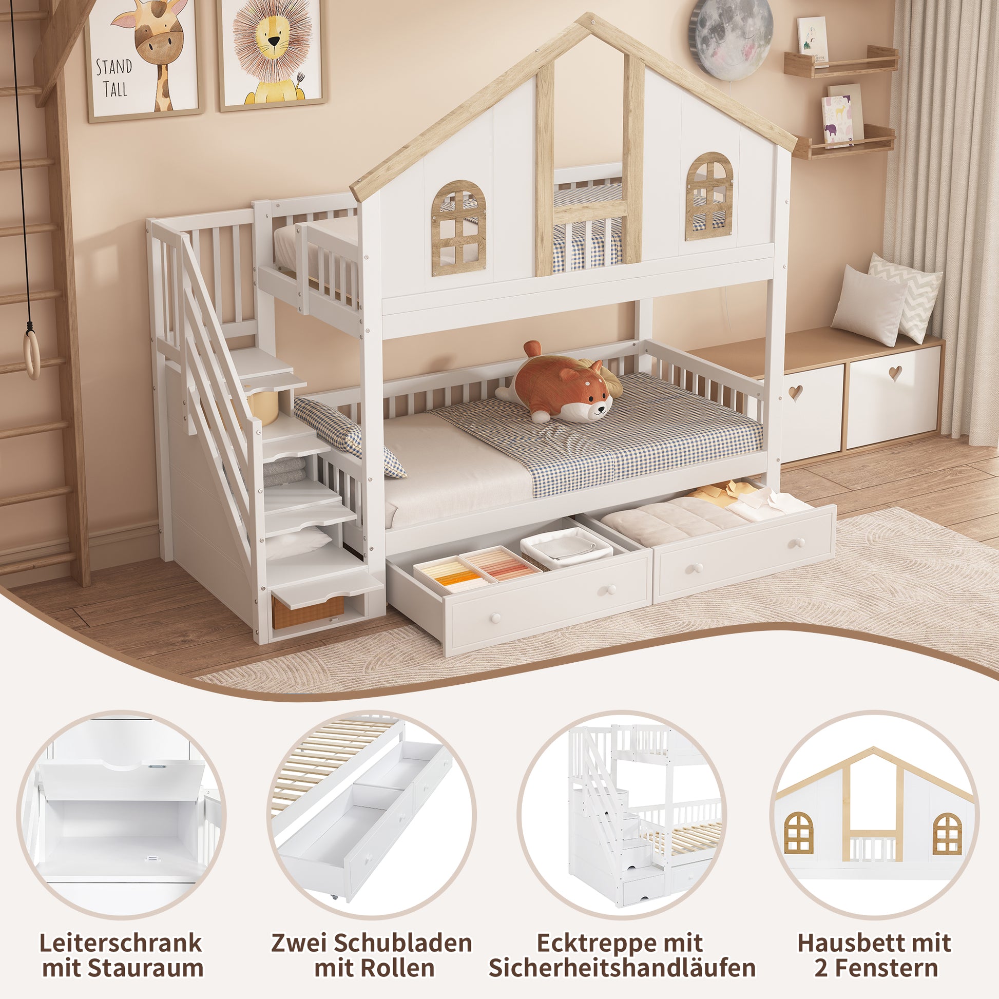 This bunk bed combines functionality with a playful design, featuring two beautiful windows. The ladder cabinets make optimal use of space, providing not only convenient access to the top bunk but also four storage cabinets with doors. The two under-bed drawers are equipped with casters for easy movement, creating additional storage. With an inner diameter of 90x200cm and a color scheme of white and natural colors, this bed is an ideal combination of functionality, safety, and aesthetic design for a child's room.