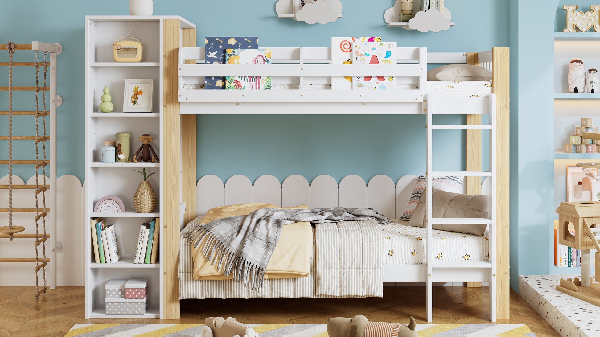 Bunk Bed, Child's with Ladder, Storage & Wardrobe, Pine+PB White+Natural