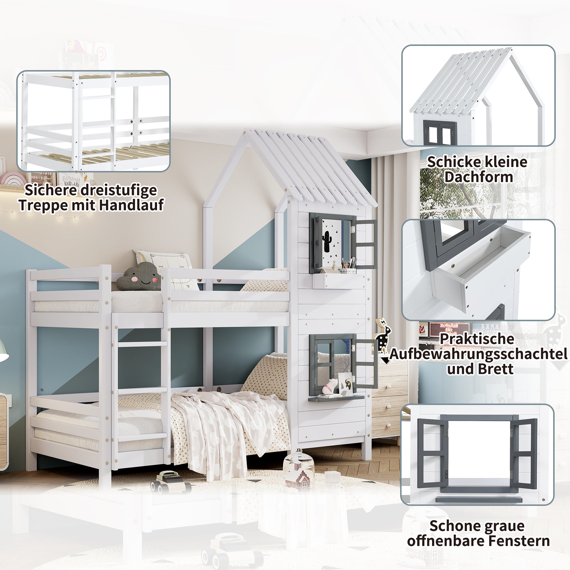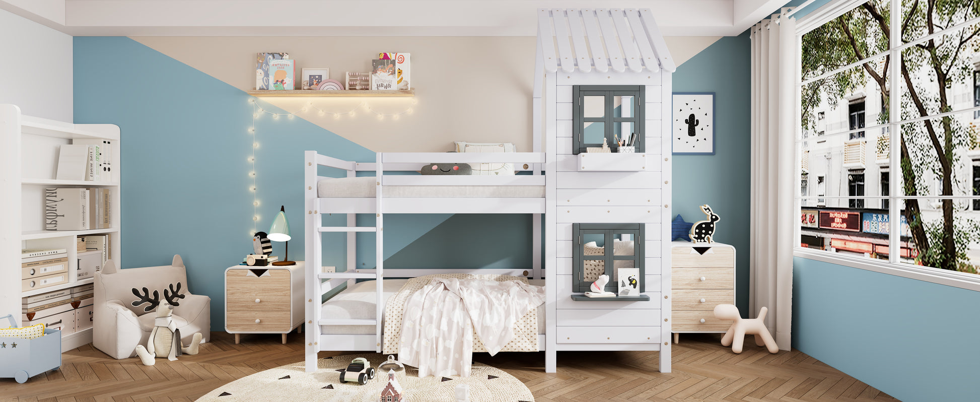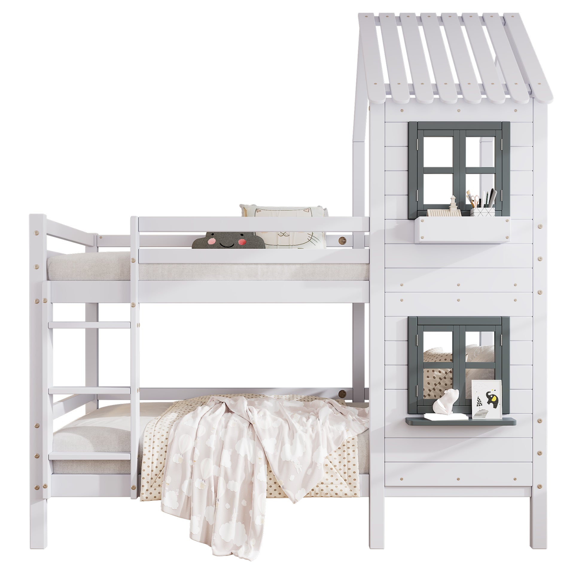 The recommended mattress size for this bunk bed is 90x200cm, with a suggested thickness of 13cm. This beautifully coordinated house bunk bed features gray windows and shelves, along with a small white storage box that is aesthetically pleasing and offers temporary storage for small items. The house shape and window create a cozy feeling. The side ladder with handrails is safe and attractive, making it a reassuring choice for both parents and children.