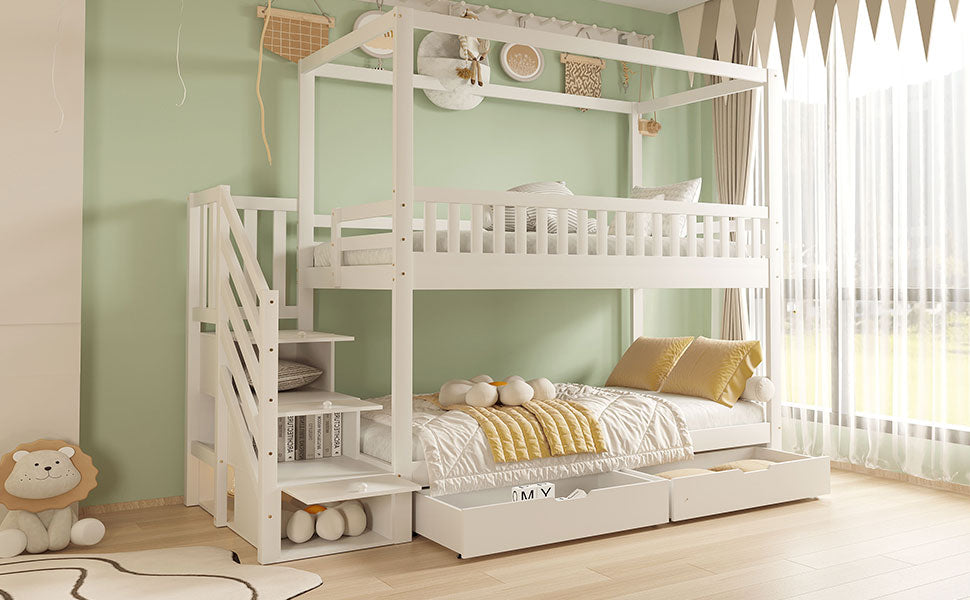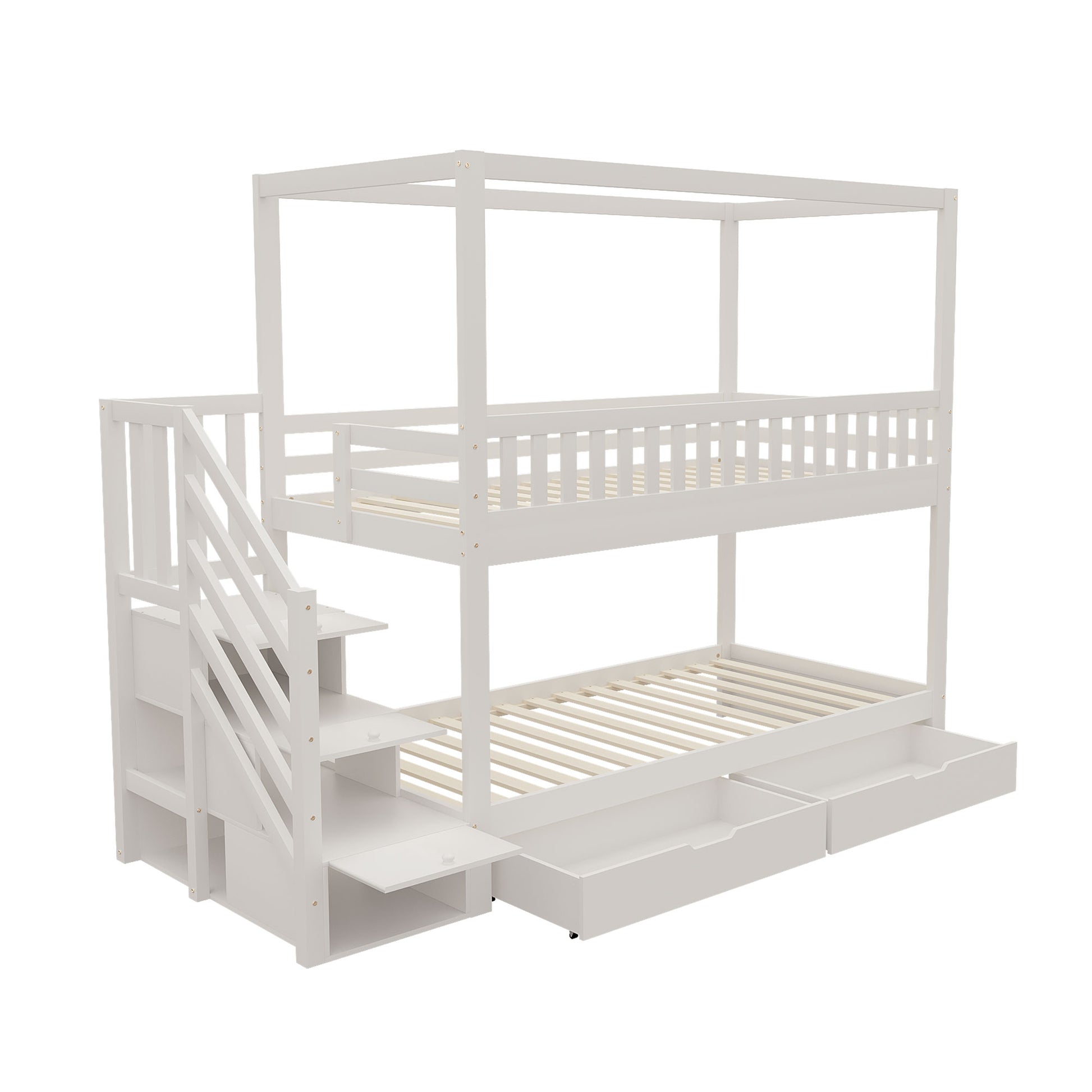 Bunk Bed, House-Shaped, Safety Railing, Storage, Solid Wood White